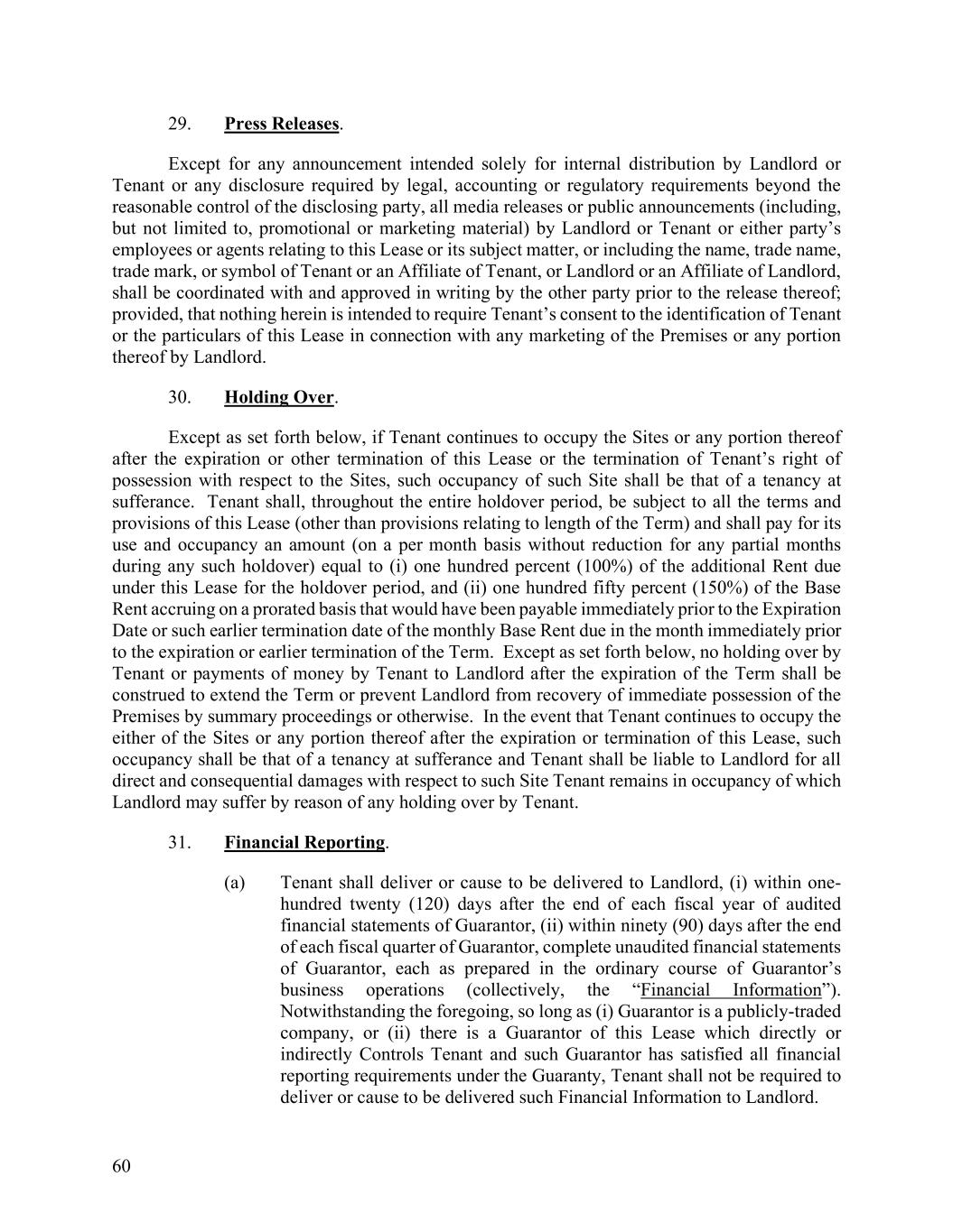 60 29. Press Releases. Except for any announcement intended solely for internal distribution by Landlord or Tenant or any disclosure required by legal, accounting or regulatory requirements beyond the reasonable control of the disclosing party, all media releases or public announcements (including, but not limited to, promotional or marketing material) by Landlord or Tenant or either party’s employees or agents relating to this Lease or its subject matter, or including the name, trade name, trade mark, or symbol of Tenant or an Affiliate of Tenant, or Landlord or an Affiliate of Landlord, shall be coordinated with and approved in writing by the other party prior to the release thereof; provided, that nothing herein is intended to require Tenant’s consent to the identification of Tenant or the particulars of this Lease in connection with any marketing of the Premises or any portion thereof by Landlord. 30. Holding Over. Except as set forth below, if Tenant continues to occupy the Sites or any portion thereof after the expiration or other termination of this Lease or the termination of Tenant’s right of possession with respect to the Sites, such occupancy of such Site shall be that of a tenancy at sufferance. Tenant shall, throughout the entire holdover period, be subject to all the terms and provisions of this Lease (other than provisions relating to length of the Term) and shall pay for its use and occupancy an amount (on a per month basis without reduction for any partial months during any such holdover) equal to (i) one hundred percent (100%) of the additional Rent due under this Lease for the holdover period, and (ii) one hundred fifty percent (150%) of the Base Rent accruing on a prorated basis that would have been payable immediately prior to the Expiration Date or such earlier termination date of the monthly Base Rent due in the month immediately prior to the expiration or earlier termination of the Term. Except as set forth below, no holding over by Tenant or payments of money by Tenant to Landlord after the expiration of the Term shall be construed to extend the Term or prevent Landlord from recovery of immediate possession of the Premises by summary proceedings or otherwise. In the event that Tenant continues to occupy the either of the Sites or any portion thereof after the expiration or termination of this Lease, such occupancy shall be that of a tenancy at sufferance and Tenant shall be liable to Landlord for all direct and consequential damages with respect to such Site Tenant remains in occupancy of which Landlord may suffer by reason of any holding over by Tenant. 31. Financial Reporting. (a) Tenant shall deliver or cause to be delivered to Landlord, (i) within one- hundred twenty (120) days after the end of each fiscal year of audited financial statements of Guarantor, (ii) within ninety (90) days after the end of each fiscal quarter of Guarantor, complete unaudited financial statements of Guarantor, each as prepared in the ordinary course of Guarantor’s business operations (collectively, the “Financial Information”). Notwithstanding the foregoing, so long as (i) Guarantor is a publicly-traded company, or (ii) there is a Guarantor of this Lease which directly or indirectly Controls Tenant and such Guarantor has satisfied all financial reporting requirements under the Guaranty, Tenant shall not be required to deliver or cause to be delivered such Financial Information to Landlord.