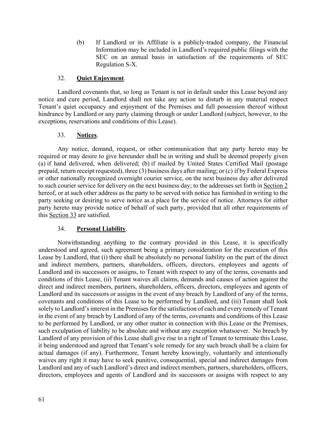 61 (b) If Landlord or its Affiliate is a publicly-traded company, the Financial Information may be included in Landlord’s required public filings with the SEC on an annual basis in satisfaction of the requirements of SEC Regulation S-X. 32. Quiet Enjoyment. Landlord covenants that, so long as Tenant is not in default under this Lease beyond any notice and cure period, Landlord shall not take any action to disturb in any material respect Tenant’s quiet occupancy and enjoyment of the Premises and full possession thereof without hindrance by Landlord or any party claiming through or under Landlord (subject, however, to the exceptions, reservations and conditions of this Lease). 33. Notices. Any notice, demand, request, or other communication that any party hereto may be required or may desire to give hereunder shall be in writing and shall be deemed properly given (a) if hand delivered, when delivered; (b) if mailed by United States Certified Mail (postage prepaid, return receipt requested), three (3) business days after mailing; or (c) if by Federal Express or other nationally recognized overnight courier service, on the next business day after delivered to such courier service for delivery on the next business day; to the addresses set forth in Section 2 hereof, or at such other address as the party to be served with notice has furnished in writing to the party seeking or desiring to serve notice as a place for the service of notice. Attorneys for either party hereto may provide notice of behalf of such party, provided that all other requirements of this Section 33 are satisfied. 34. Personal Liability. Notwithstanding anything to the contrary provided in this Lease, it is specifically understood and agreed, such agreement being a primary consideration for the execution of this Lease by Landlord, that (i) there shall be absolutely no personal liability on the part of the direct and indirect members, partners, shareholders, officers, directors, employees and agents of Landlord and its successors or assigns, to Tenant with respect to any of the terms, covenants and conditions of this Lease, (ii) Tenant waives all claims, demands and causes of action against the direct and indirect members, partners, shareholders, officers, directors, employees and agents of Landlord and its successors or assigns in the event of any breach by Landlord of any of the terms, covenants and conditions of this Lease to be performed by Landlord, and (iii) Tenant shall look solely to Landlord’s interest in the Premises for the satisfaction of each and every remedy of Tenant in the event of any breach by Landlord of any of the terms, covenants and conditions of this Lease to be performed by Landlord, or any other matter in connection with this Lease or the Premises, such exculpation of liability to be absolute and without any exception whatsoever. No breach by Landlord of any provision of this Lease shall give rise to a right of Tenant to terminate this Lease, it being understood and agreed that Tenant’s sole remedy for any such breach shall be a claim for actual damages (if any). Furthermore, Tenant hereby knowingly, voluntarily and intentionally waives any right it may have to seek punitive, consequential, special and indirect damages from Landlord and any of such Landlord’s direct and indirect members, partners, shareholders, officers, directors, employees and agents of Landlord and its successors or assigns with respect to any