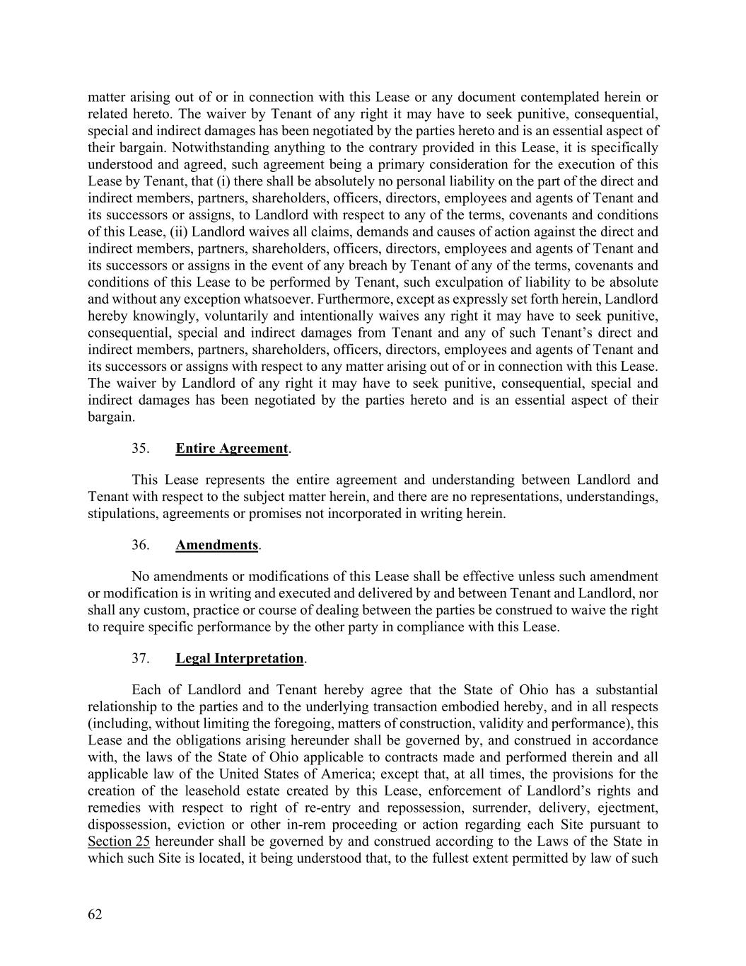 62 matter arising out of or in connection with this Lease or any document contemplated herein or related hereto. The waiver by Tenant of any right it may have to seek punitive, consequential, special and indirect damages has been negotiated by the parties hereto and is an essential aspect of their bargain. Notwithstanding anything to the contrary provided in this Lease, it is specifically understood and agreed, such agreement being a primary consideration for the execution of this Lease by Tenant, that (i) there shall be absolutely no personal liability on the part of the direct and indirect members, partners, shareholders, officers, directors, employees and agents of Tenant and its successors or assigns, to Landlord with respect to any of the terms, covenants and conditions of this Lease, (ii) Landlord waives all claims, demands and causes of action against the direct and indirect members, partners, shareholders, officers, directors, employees and agents of Tenant and its successors or assigns in the event of any breach by Tenant of any of the terms, covenants and conditions of this Lease to be performed by Tenant, such exculpation of liability to be absolute and without any exception whatsoever. Furthermore, except as expressly set forth herein, Landlord hereby knowingly, voluntarily and intentionally waives any right it may have to seek punitive, consequential, special and indirect damages from Tenant and any of such Tenant’s direct and indirect members, partners, shareholders, officers, directors, employees and agents of Tenant and its successors or assigns with respect to any matter arising out of or in connection with this Lease. The waiver by Landlord of any right it may have to seek punitive, consequential, special and indirect damages has been negotiated by the parties hereto and is an essential aspect of their bargain. 35. Entire Agreement. This Lease represents the entire agreement and understanding between Landlord and Tenant with respect to the subject matter herein, and there are no representations, understandings, stipulations, agreements or promises not incorporated in writing herein. 36. Amendments. No amendments or modifications of this Lease shall be effective unless such amendment or modification is in writing and executed and delivered by and between Tenant and Landlord, nor shall any custom, practice or course of dealing between the parties be construed to waive the right to require specific performance by the other party in compliance with this Lease. 37. Legal Interpretation. Each of Landlord and Tenant hereby agree that the State of Ohio has a substantial relationship to the parties and to the underlying transaction embodied hereby, and in all respects (including, without limiting the foregoing, matters of construction, validity and performance), this Lease and the obligations arising hereunder shall be governed by, and construed in accordance with, the laws of the State of Ohio applicable to contracts made and performed therein and all applicable law of the United States of America; except that, at all times, the provisions for the creation of the leasehold estate created by this Lease, enforcement of Landlord’s rights and remedies with respect to right of re-entry and repossession, surrender, delivery, ejectment, dispossession, eviction or other in-rem proceeding or action regarding each Site pursuant to Section 25 hereunder shall be governed by and construed according to the Laws of the State in which such Site is located, it being understood that, to the fullest extent permitted by law of such