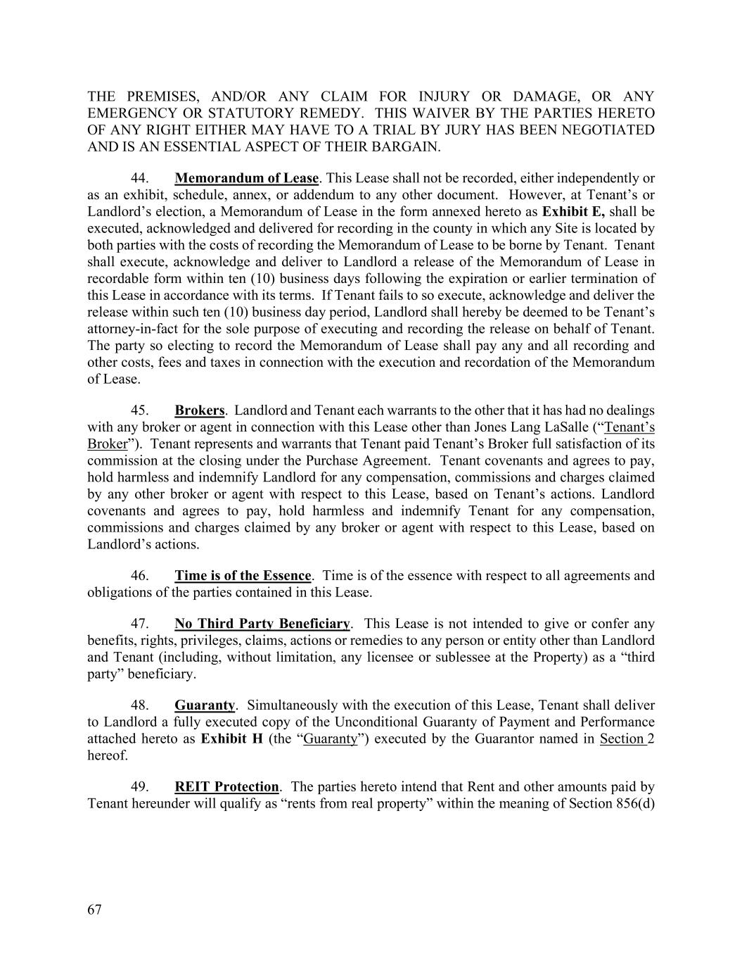 67 THE PREMISES, AND/OR ANY CLAIM FOR INJURY OR DAMAGE, OR ANY EMERGENCY OR STATUTORY REMEDY. THIS WAIVER BY THE PARTIES HERETO OF ANY RIGHT EITHER MAY HAVE TO A TRIAL BY JURY HAS BEEN NEGOTIATED AND IS AN ESSENTIAL ASPECT OF THEIR BARGAIN. 44. Memorandum of Lease. This Lease shall not be recorded, either independently or as an exhibit, schedule, annex, or addendum to any other document. However, at Tenant’s or Landlord’s election, a Memorandum of Lease in the form annexed hereto as Exhibit E, shall be executed, acknowledged and delivered for recording in the county in which any Site is located by both parties with the costs of recording the Memorandum of Lease to be borne by Tenant. Tenant shall execute, acknowledge and deliver to Landlord a release of the Memorandum of Lease in recordable form within ten (10) business days following the expiration or earlier termination of this Lease in accordance with its terms. If Tenant fails to so execute, acknowledge and deliver the release within such ten (10) business day period, Landlord shall hereby be deemed to be Tenant’s attorney-in-fact for the sole purpose of executing and recording the release on behalf of Tenant. The party so electing to record the Memorandum of Lease shall pay any and all recording and other costs, fees and taxes in connection with the execution and recordation of the Memorandum of Lease. 45. Brokers. Landlord and Tenant each warrants to the other that it has had no dealings with any broker or agent in connection with this Lease other than Jones Lang LaSalle (“Tenant’s Broker”). Tenant represents and warrants that Tenant paid Tenant’s Broker full satisfaction of its commission at the closing under the Purchase Agreement. Tenant covenants and agrees to pay, hold harmless and indemnify Landlord for any compensation, commissions and charges claimed by any other broker or agent with respect to this Lease, based on Tenant’s actions. Landlord covenants and agrees to pay, hold harmless and indemnify Tenant for any compensation, commissions and charges claimed by any broker or agent with respect to this Lease, based on Landlord’s actions. 46. Time is of the Essence. Time is of the essence with respect to all agreements and obligations of the parties contained in this Lease. 47. No Third Party Beneficiary. This Lease is not intended to give or confer any benefits, rights, privileges, claims, actions or remedies to any person or entity other than Landlord and Tenant (including, without limitation, any licensee or sublessee at the Property) as a “third party” beneficiary. 48. Guaranty. Simultaneously with the execution of this Lease, Tenant shall deliver to Landlord a fully executed copy of the Unconditional Guaranty of Payment and Performance attached hereto as Exhibit H (the “Guaranty”) executed by the Guarantor named in Section 2 hereof. 49. REIT Protection. The parties hereto intend that Rent and other amounts paid by Tenant hereunder will qualify as “rents from real property” within the meaning of Section 856(d)