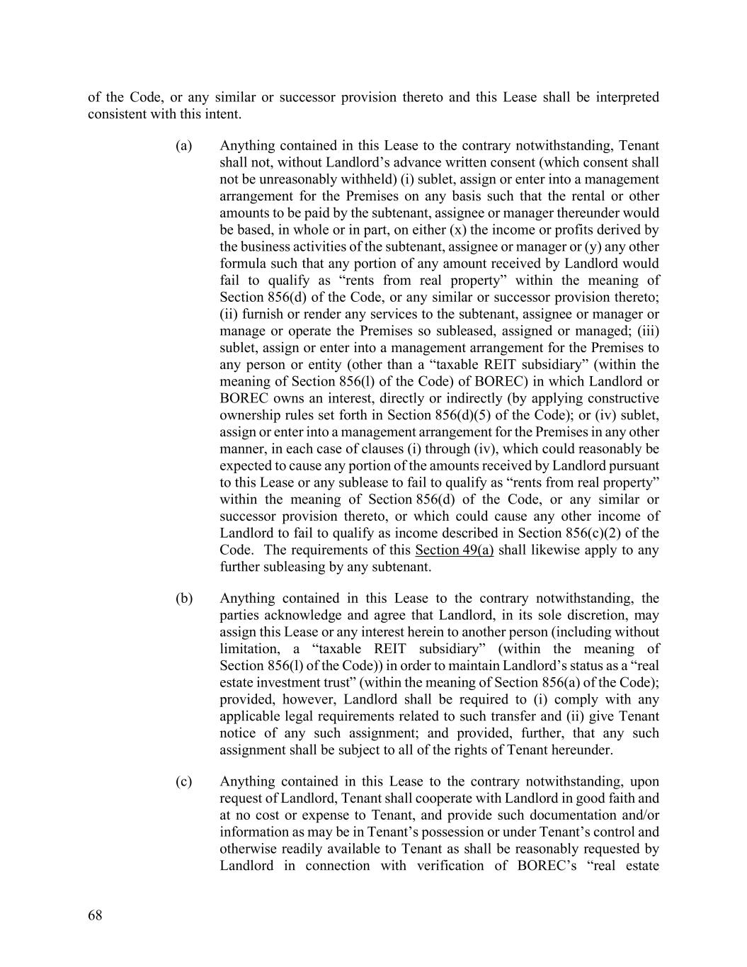 68 of the Code, or any similar or successor provision thereto and this Lease shall be interpreted consistent with this intent. (a) Anything contained in this Lease to the contrary notwithstanding, Tenant shall not, without Landlord’s advance written consent (which consent shall not be unreasonably withheld) (i) sublet, assign or enter into a management arrangement for the Premises on any basis such that the rental or other amounts to be paid by the subtenant, assignee or manager thereunder would be based, in whole or in part, on either (x) the income or profits derived by the business activities of the subtenant, assignee or manager or (y) any other formula such that any portion of any amount received by Landlord would fail to qualify as “rents from real property” within the meaning of Section 856(d) of the Code, or any similar or successor provision thereto; (ii) furnish or render any services to the subtenant, assignee or manager or manage or operate the Premises so subleased, assigned or managed; (iii) sublet, assign or enter into a management arrangement for the Premises to any person or entity (other than a “taxable REIT subsidiary” (within the meaning of Section 856(l) of the Code) of BOREC) in which Landlord or BOREC owns an interest, directly or indirectly (by applying constructive ownership rules set forth in Section 856(d)(5) of the Code); or (iv) sublet, assign or enter into a management arrangement for the Premises in any other manner, in each case of clauses (i) through (iv), which could reasonably be expected to cause any portion of the amounts received by Landlord pursuant to this Lease or any sublease to fail to qualify as “rents from real property” within the meaning of Section 856(d) of the Code, or any similar or successor provision thereto, or which could cause any other income of Landlord to fail to qualify as income described in Section 856(c)(2) of the Code. The requirements of this Section 49(a) shall likewise apply to any further subleasing by any subtenant. (b) Anything contained in this Lease to the contrary notwithstanding, the parties acknowledge and agree that Landlord, in its sole discretion, may assign this Lease or any interest herein to another person (including without limitation, a “taxable REIT subsidiary” (within the meaning of Section 856(l) of the Code)) in order to maintain Landlord’s status as a “real estate investment trust” (within the meaning of Section 856(a) of the Code); provided, however, Landlord shall be required to (i) comply with any applicable legal requirements related to such transfer and (ii) give Tenant notice of any such assignment; and provided, further, that any such assignment shall be subject to all of the rights of Tenant hereunder. (c) Anything contained in this Lease to the contrary notwithstanding, upon request of Landlord, Tenant shall cooperate with Landlord in good faith and at no cost or expense to Tenant, and provide such documentation and/or information as may be in Tenant’s possession or under Tenant’s control and otherwise readily available to Tenant as shall be reasonably requested by Landlord in connection with verification of BOREC’s “real estate