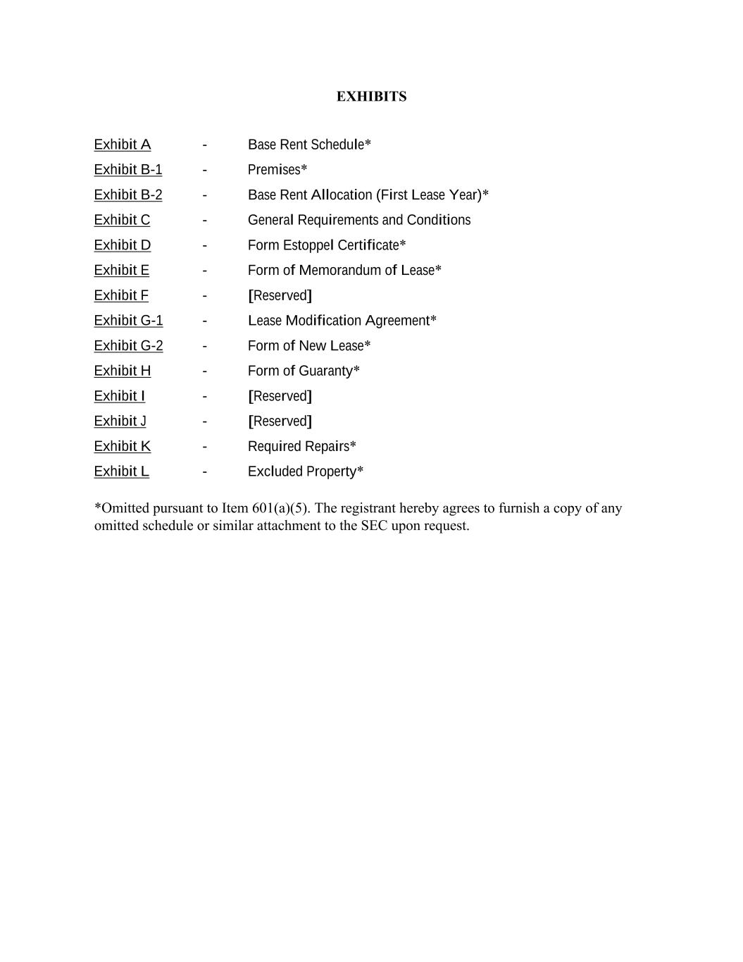 EXHIBITS Exhibit A Exhibit B-1 Exhibit B-2 Exhibit C Exhibit D Exhibit E Exhibit F Exhibit G-1 Exhibit G-2 Exhibit H Exhibit I Exhibit J Exhibit K Exhibit L - Base Rent Schedule* - Premises* - Base Rent Allocation (First Lease Year)* - General Requirements and Conditions - Form Estoppel Certificate* - Form of Memorandum of Lease* - [Reserved] - Lease Modification Agreement* - Form of New Lease* - Form of Guaranty* - [Reserved] - [Reserved] - Required Repairs* - Excluded Property* *Omitted pursuant to Item 601(a)(5). The registrant hereby agrees to furnish a copy of any omitted schedule or similar attachment to the SEC upon request.