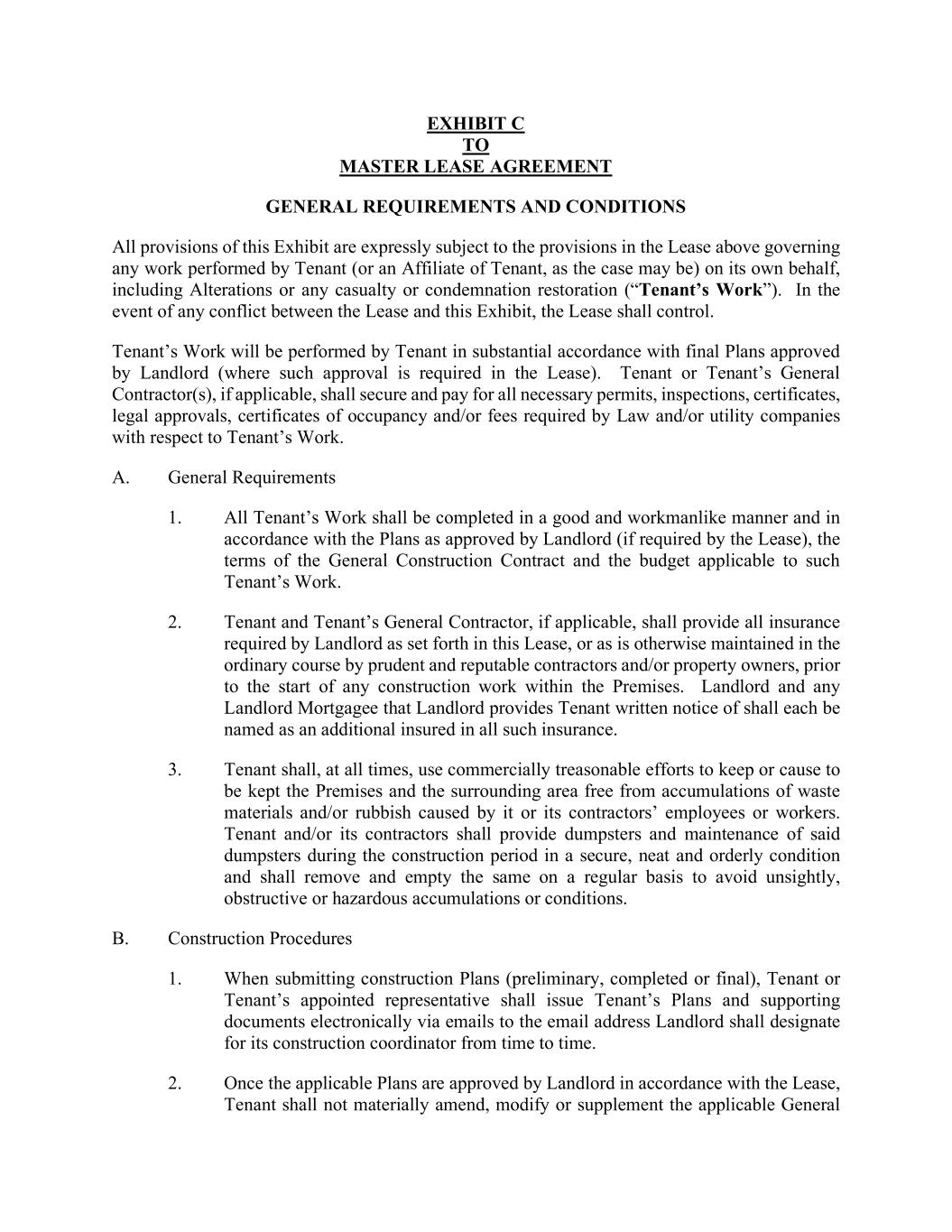 EXHIBIT C TO MASTER LEASE AGREEMENT GENERAL REQUIREMENTS AND CONDITIONS All provisions of this Exhibit are expressly subject to the provisions in the Lease above governing any work performed by Tenant (or an Affiliate of Tenant, as the case may be) on its own behalf, including Alterations or any casualty or condemnation restoration (“Tenant’s Work”). In the event of any conflict between the Lease and this Exhibit, the Lease shall control. Tenant’s Work will be performed by Tenant in substantial accordance with final Plans approved by Landlord (where such approval is required in the Lease). Tenant or Tenant’s General Contractor(s), if applicable, shall secure and pay for all necessary permits, inspections, certificates, legal approvals, certificates of occupancy and/or fees required by Law and/or utility companies with respect to Tenant’s Work. A. General Requirements 1. All Tenant’s Work shall be completed in a good and workmanlike manner and in accordance with the Plans as approved by Landlord (if required by the Lease), the terms of the General Construction Contract and the budget applicable to such Tenant’s Work. 2. Tenant and Tenant’s General Contractor, if applicable, shall provide all insurance required by Landlord as set forth in this Lease, or as is otherwise maintained in the ordinary course by prudent and reputable contractors and/or property owners, prior to the start of any construction work within the Premises. Landlord and any Landlord Mortgagee that Landlord provides Tenant written notice of shall each be named as an additional insured in all such insurance. 3. Tenant shall, at all times, use commercially treasonable efforts to keep or cause to be kept the Premises and the surrounding area free from accumulations of waste materials and/or rubbish caused by it or its contractors’ employees or workers. Tenant and/or its contractors shall provide dumpsters and maintenance of said dumpsters during the construction period in a secure, neat and orderly condition and shall remove and empty the same on a regular basis to avoid unsightly, obstructive or hazardous accumulations or conditions. B. Construction Procedures 1. When submitting construction Plans (preliminary, completed or final), Tenant or Tenant’s appointed representative shall issue Tenant’s Plans and supporting documents electronically via emails to the email address Landlord shall designate for its construction coordinator from time to time. 2. Once the applicable Plans are approved by Landlord in accordance with the Lease, Tenant shall not materially amend, modify or supplement the applicable General