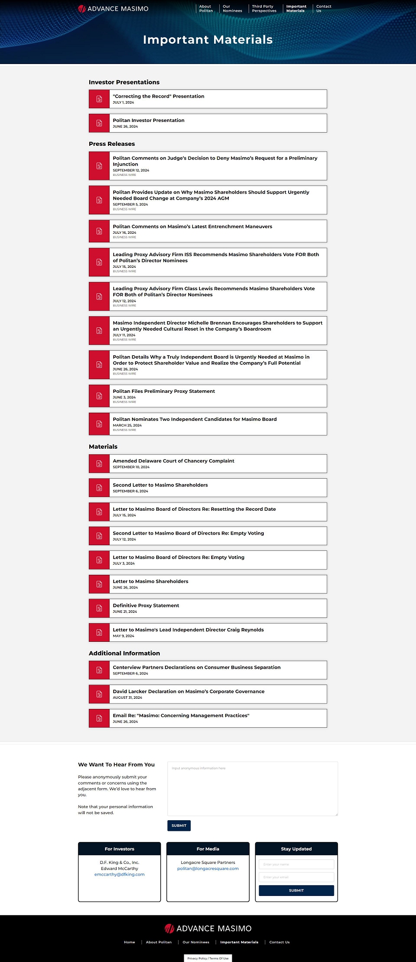 Shareholders Can Vote for Politan’s Independent Nominees, Darlene Solomon and William Jellison, on the WHITE Card and Can Visit www.AdvanceMasimo.com for Further Information