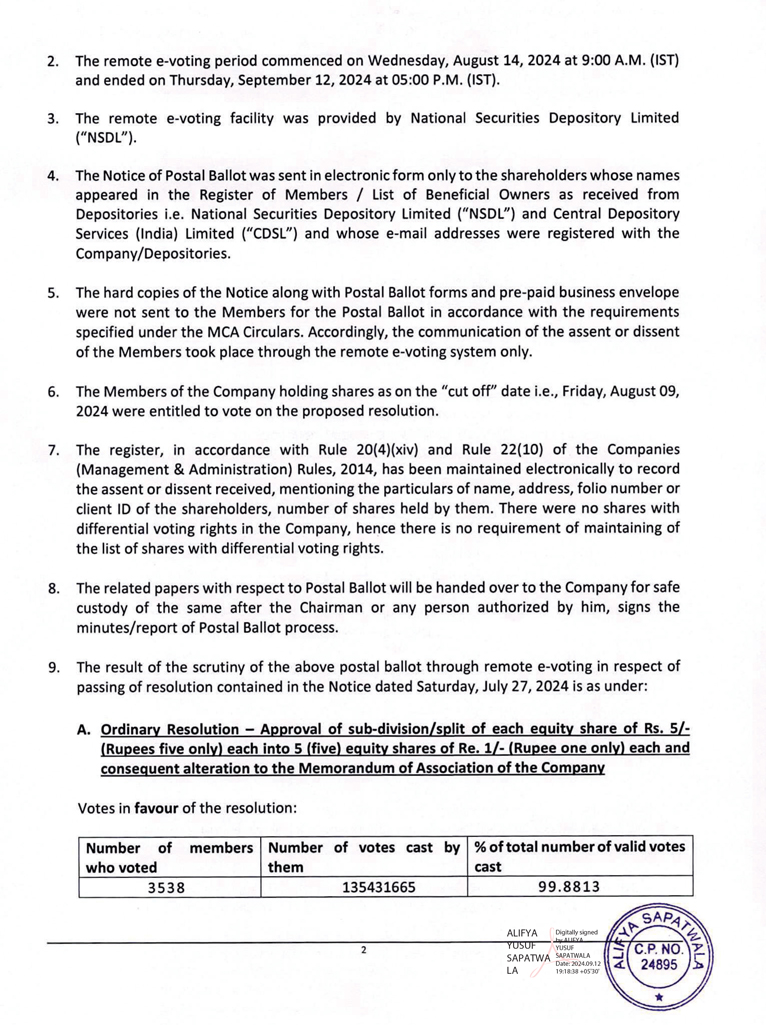 | Date: September 12, 2024 | By: | /s/ K Randhir Singh | |