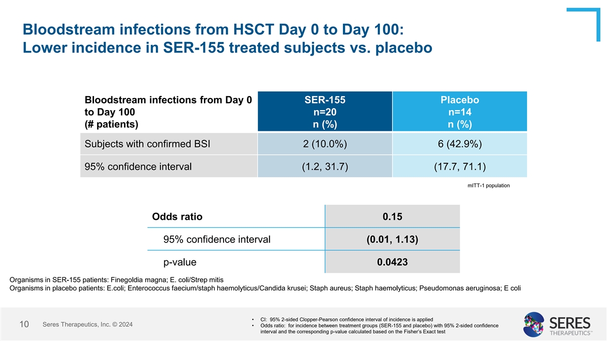 Efficacy: SER-155 administration favorable with significant* reduction in both bacterial BSIs and systemic antibiotic exposure; lower febrile neutropenia Significant decrease in bacterial bloodstream infections in SER-155-treated Bloodstream infections subjects vs. placebo Numerically lower incidence rate of febrile neutropenia in SER-155-treated Febrile neutropenia subjects vs. placebo All GI infections were CDI**; 4 subjects in SER-155-treated (20%) and 2 GI infections subjects in placebo (14.3%) developed GI infections from HSCT Day 0-100 No subjects in either arm developed ≥ Grade 3 acute GvHD; Acute GvHD 2 subjects in each arm developed Grade 2 acute GvHD Significantly lower mean cumulative exposure (days) to systemic antibacterials / antimycotics for SER-155-treated subjects vs. placebo Antibacterial / antimycotic exposure Significantly lower cumulative exposure rate to systemic antibacterials / antimycotics for SER-155-treated subjects vs. placebo * no multiplicity adjustments were applied Seres Therapeutics, Inc. © 2024 9 ** CDI: C. difficile infection Exploratory Secondary Efficacy Efficacy