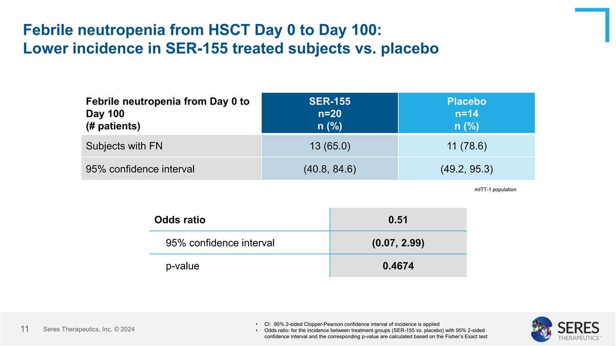 Bloodstream infections from HSCT Day 0 to Day 100: Lower incidence in SER-155 treated subjects vs. placebo Bloodstream infections from Day 0 SER-155 Placebo to Day 100 n=20 n=14 (# patients) n (%) n (%) Subjects with confirmed BSI 2 (10.0%) 6 (42.9%) 95% confidence interval (1.2, 31.7) (17.7, 71.1) mITT-1 population Odds ratio 0.15 95% confidence interval (0.01, 1.13) p-value 0.0423 Organisms in SER-155 patients: Finegoldia magna; E. coli/Strep mitis Organisms in placebo patients: E.coli; Enterococcus faecium/staph haemolyticus/Candida krusei; Staph aureus; Staph haemolyticus; Pseudomonas aeruginosa; E coli • CI: 95% 2-sided Clopper-Pearson confidence interval of incidence is applied Seres Therapeutics, Inc. © 2024 10 • Odds ratio: for incidence between treatment groups (SER-155 and placebo) with 95% 2-sided confidence interval and the corresponding p-value calculated based on the Fisher’s Exact test