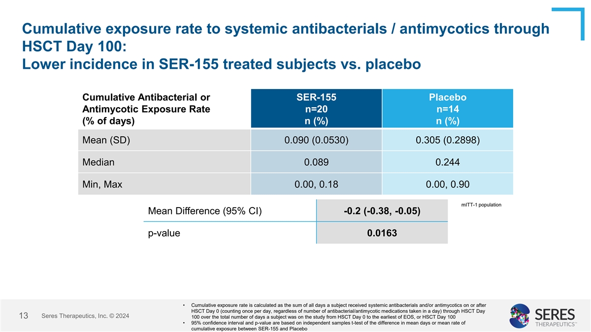 Cumulative exposure to systemic antibacterials / antimycotics through HSCT Day 100: Lower incidence in SER-155 treated subjects vs. placebo Cumulative Antibacterial or SER-155 Placebo Antimycotic Exposure n=20 n=14 (HSCT Days) n (%) n (%) Mean (SD) 9.2 (5.44) 21.1 (20.31) Median 9.0 14.0 Min, Max 0, 19 0, 74 mITT-1 population Mean Difference (95% CI) -11.9 (-23.85, -0.04) p-value 0.0494 • Cumulative exposure is the sum of all days a subject received systemic antibacterials and/or antimycotics between HSCT Day 0 through Day 100; counting once per day regardless of number of agents taken Seres Therapeutics, Inc. © 2024 12 • 95% confidence interval and p-value based on independent samples t-test of the difference in mean days between SER- 155 and placebo