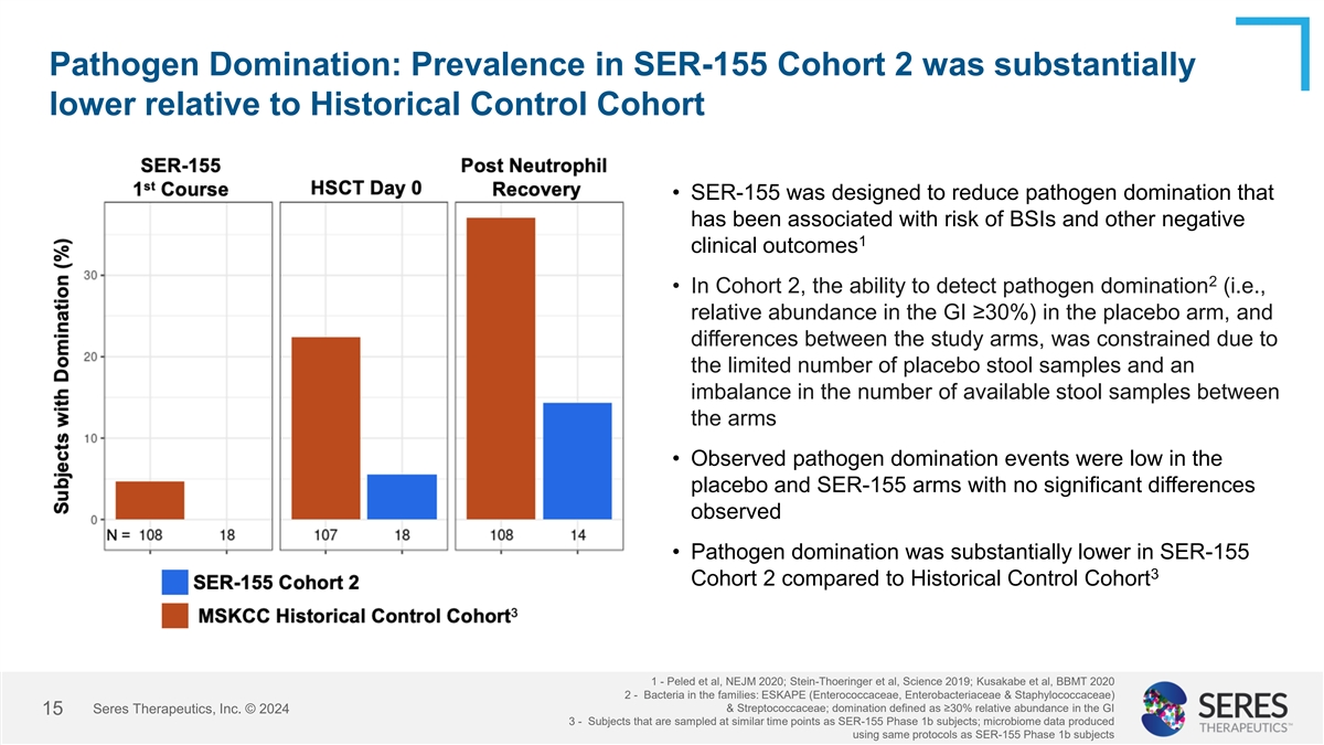 SER-155 Strain Engraftment: Primary objective achieved - drug bacteria strain engraftment was robust and as expected • The majority of SER-155 strains were present at start of HSCT conditioning and durable through chemotherapy exposure • Engraftment decreased but was detectable post- neutrophil recovery, suggesting sustained engraftment, even under unfavorable GI conditions (e.g., antibiotic exposure), and through period of greatest BSI susceptibility • The second course of SER-155 was effective at increasing strain engraftment following transplant & neutrophil recovery, with engraftment durable out to day 100 following transplant • Cohort 1 and Cohort 2 engraftment magnitude and kinetics had high congruence Seres Therapeutics, Inc. © 2024 14