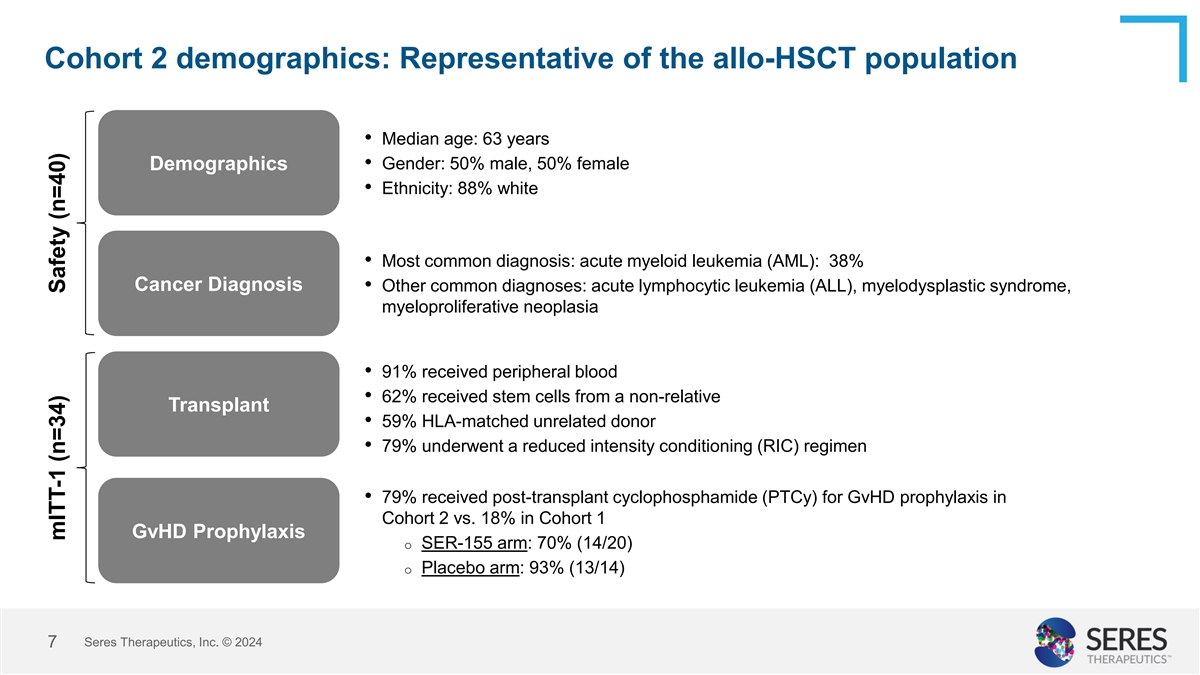 Cohort 2 patient disposition ITT Safety mITT-1 SER-155 n = 23 n = 21 n = 20 -2 randomized untreated -1 consent withdrawal mITT-1 population studied for efficacy Safety mITT-1 ITT Placebo n = 19 n = 14 n = 22 -3 randomized untreated -3 disease progression -1 transplant delay -1 consent withdrawal ITT (intent-to-treat): all enrolled subjects Seres Therapeutics, Inc. © 2024 6 Safety: all subjects receiving any amount of drug st m-ITT1 (modified intent-to-treat 1): all subjects who received study drug in 1 course and underwent HSCT