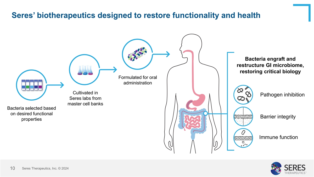 GI microbiome functional disruption leads to disease susceptibility GI Microbiome: Healthy Functionally disrupted IMPACTED BIOLOGY • Pathogen domination • Lost barrier & mucosal integrity • Unfavorable immune responses Commensal microbes Pathogenic microbes Seres Therapeutics, Inc. © 2024 9