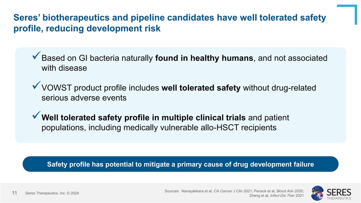 Seres’ biotherapeutics designed to restore functionality and health Bacteria engraft and restructure GI microbiome, restoring critical biology Formulated for oral administration Cultivated in Pathogen inhibition Seres labs from master cell banks Bacteria selected based on desired functional Barrier integrity properties Immune function Seres Therapeutics, Inc. © 2024 10
