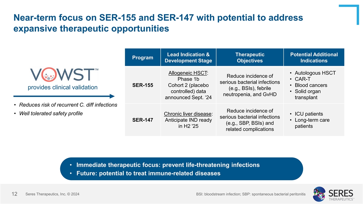 Seres’ biotherapeutics and pipeline candidates have well tolerated safety profile, reducing development risk ✓Based on GI bacteria naturally found in healthy humans, and not associated with disease ✓VOWST product profile includes well tolerated safety without drug-related serious adverse events ✓Well tolerated safety profile in multiple clinical trials and patient populations, including medically vulnerable allo-HSCT recipients Safety profile has potential to mitigate a primary cause of drug development failure Sources: Nanayakkara et al, CA Cancer J Clin 2021; Penack et al, Blood Adv 2020; Seres Therapeutics, Inc. © 2024 11 Zheng et al, Infect Dis Ther 2021
