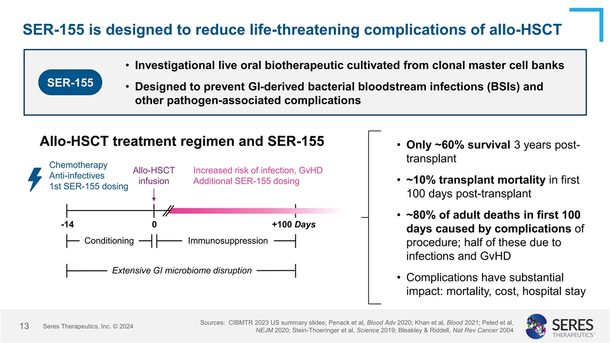 Near-term focus on SER-155 and SER-147 with potential to address expansive therapeutic opportunities Lead Indication & Therapeutic Potential Additional Program Development Stage Objectives Indications Allogeneic HSCT: • Autologous HSCT Reduce incidence of Phase 1b • CAR-T serious bacterial infections SER-155 Cohort 2 (placebo • Blood cancers provides clinical validation (e.g., BSIs), febrile controlled) data • Solid organ neutropenia, and GvHD announced Sept. ‘24 transplant • Reduces risk of recurrent C. diff infections Reduce incidence of • Well tolerated safety profile Chronic liver disease: • ICU patients serious bacterial infections SER-147 Anticipate IND ready • Long-term care (e.g., SBP, BSIs) and in H2 '25 patients related complications • Immediate therapeutic focus: prevent life-threatening infections • Future: potential to treat immune-related diseases Seres Therapeutics, Inc. © 2024 BSI: bloodstream infection; SBP: spontaneous bacterial peritonitis 12