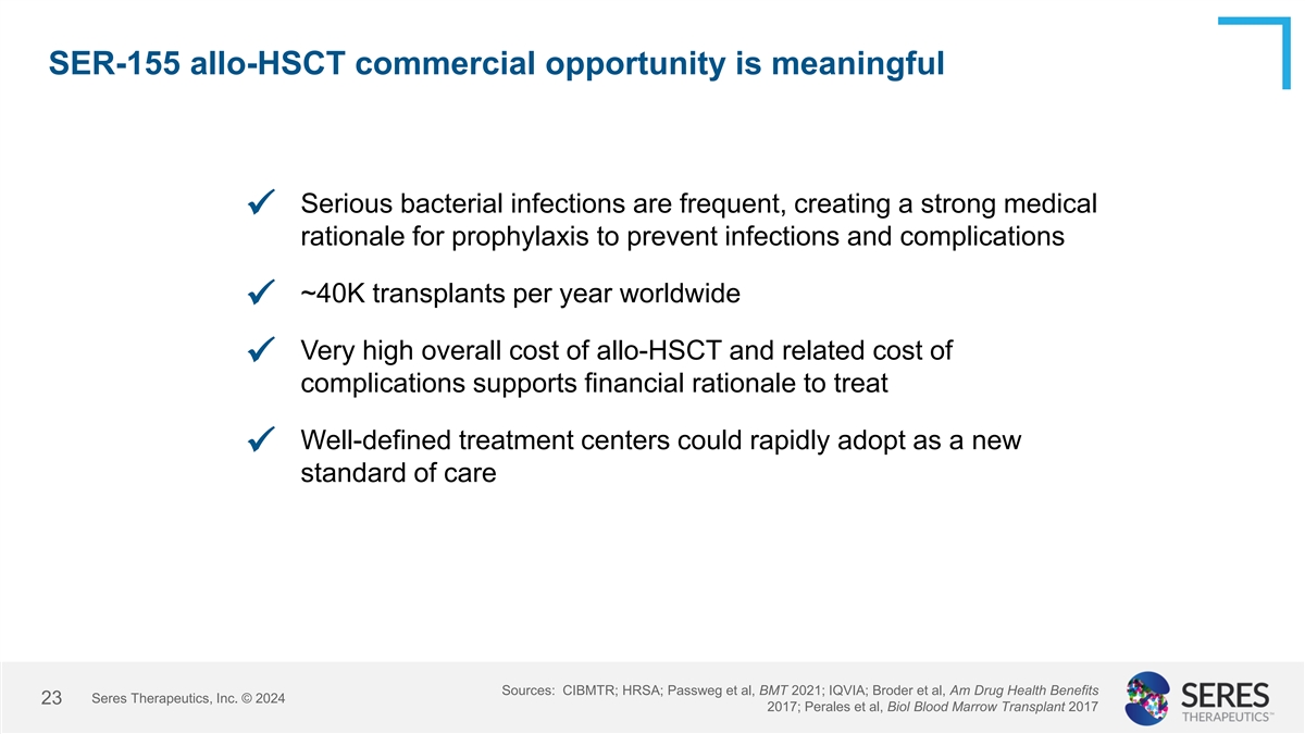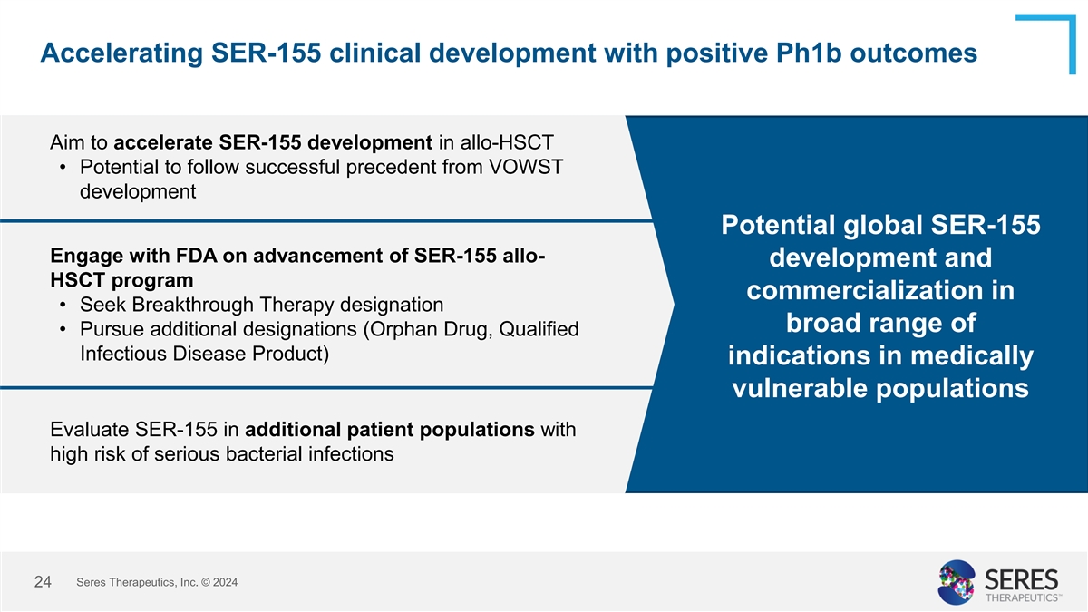SER-155 allo-HSCT commercial opportunity is meaningful Serious bacterial infections are frequent, creating a strong medical ✓ rationale for prophylaxis to prevent infections and complications ~40K transplants per year worldwide ✓ Very high overall cost of allo-HSCT and related cost of ✓ complications supports financial rationale to treat Well-defined treatment centers could rapidly adopt as a new ✓ standard of care Sources: CIBMTR; HRSA; Passweg et al, BMT 2021; IQVIA; Broder et al, Am Drug Health Benefits Seres Therapeutics, Inc. © 2024 23 2017; Perales et al, Biol Blood Marrow Transplant 2017