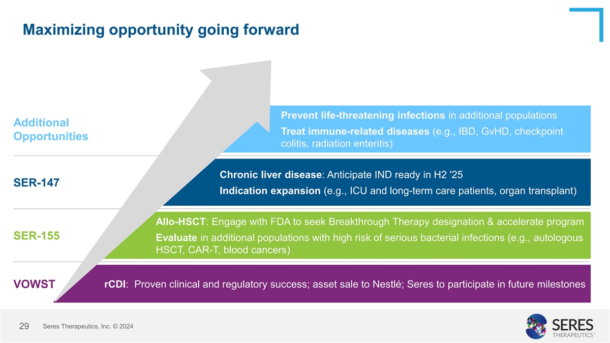 Manufacturing platform delivers defined consortia in oral formulation using cost-effective production Strain isolation and characterization pipeline to rapidly identify cGMP- suitable medium components Highly intensive strain bioprocessing leveraging flexible, single-use manufacturing technology for cost-effective production Novel formulations enabling consistent drug product composition, drug stability for distribution, and targeted drug delivery Quality systems to ensure product quality and stability, extending prior regulatory successes, including developing product release specifications with the FDA Seres Therapeutics, Inc. © 2024 28