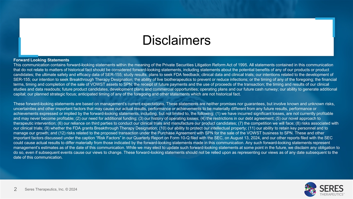 Disclaimers Forward Looking Statements This communication contains forward-looking statements within the meaning of the Private Securities Litigation Reform Act of 1995. All statements contained in this communication that do not relate to matters of historical fact should be considered forward-looking statements, including statements about the potential benefits of any of our products or product candidates; the ultimate safety and efficacy data of SER-155; study results; plans to seek FDA feedback; clinical data and clinical trials; our intentions related to the development of SER-155; our intention to seek Breakthrough Therapy Designation; the ability of live biotherapeutics to prevent or reduce infections; or the timing of any of the foregoing and other statements which are not historical fact. These forward-looking statements are based on management’s current expectations. These statements are neither promises nor guarantees, but involve known and unknown risks, uncertainties and other important factors that may cause our actual results, performance or achievements to be materially different from any future results, performance or achievements expressed or implied by the forward-looking statements, including, but not limited to, the following: (1) we have incurred significant losses, are not currently profitable and may never become profitable; (2) our need for additional funding; (3) our history of operating losses; (4) the restrictions in our debt agreement; (5) our novel approach to therapeutic intervention; (6) our reliance on third parties to conduct our clinical trials and manufacture our product candidates; (7) the competition we will face; (8) risks associated with our clinical trials; (9) whether the FDA grants Breakthrough Therapy Designation; (10) our ability to protect our intellectual property; (11) our ability to retain key personnel and to manage our growth; and (12) risks related to the proposed transaction under the Purchase Agreement with Société des Produits Nestlé S.A for the sale of the VOWST business to SPN. These and other important factors discussed under the caption “Risk Factors” in our Quarterly Report on Form 10-Q filed with the SEC, on August 13, 2024, and our other reports filed with the SEC could cause actual results to differ materially from those indicated by the forward-looking statements made in this communication. Any such forward-looking statements represent management’s estimates as of the date of this communication. While we may elect to update such forward-looking statements at some point in the future, we disclaim any obligation to do so, even if subsequent events cause our views to change. These forward-looking statements should not be relied upon as representing our views as of any date subsequent to the date of this communication. Seres Therapeutics, Inc. © 2024 2 2