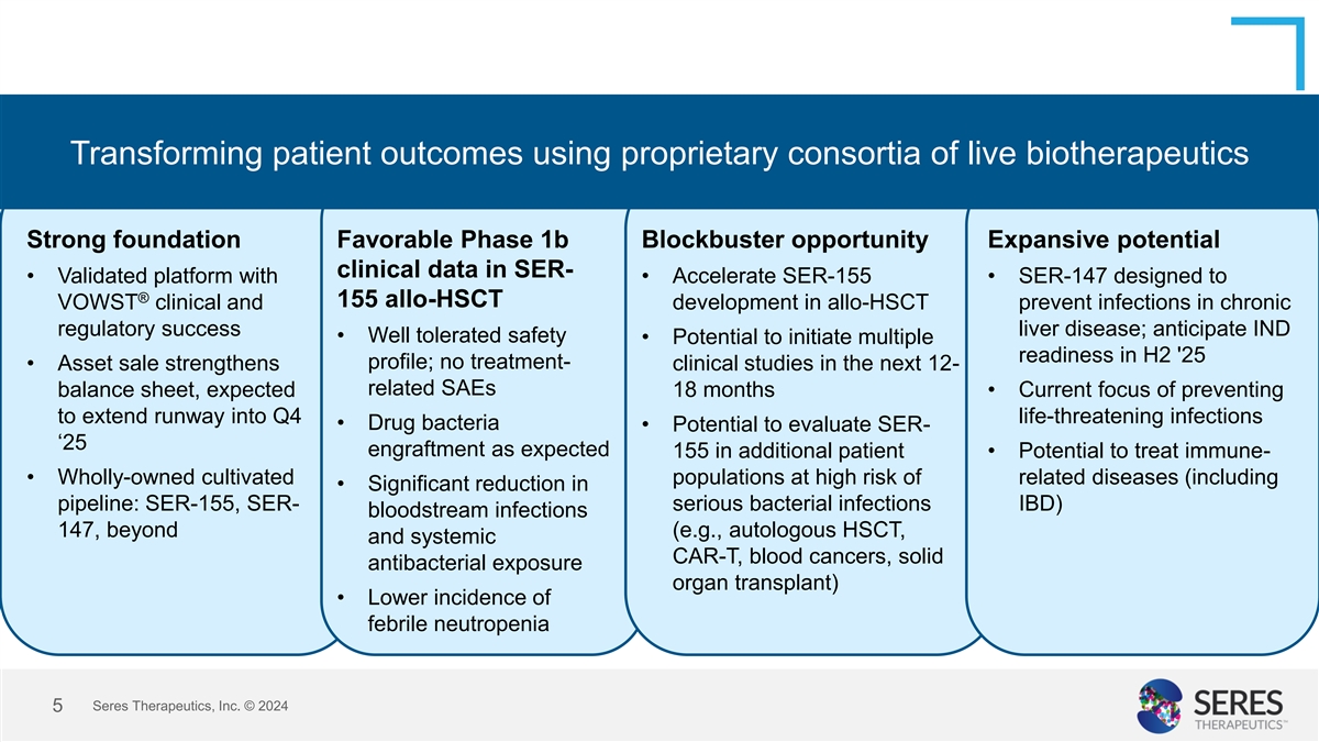 September 2024: SER-155 Phase 1b placebo-controlled Cohort 2 study results in allo-HSCT • Phase 1b study in adults undergoing allogeneic hematopoietic stem cell transplant (allo-HSCT) to assess SER-155 safety and pharmacology, with additional endpoints such as incidence of bacterial bloodstream infections and related medical consequences such as antibiotic use and febrile neutropenia • Demonstrated generally well tolerated safety profile and confirmed drug bacteria strain engraftment • SER-155 administration associated with following outcomes compared to placebo at day 100 post-HSCT: Significant reduction Significant reduction Lower incidence of in bacterial in systemic antibiotic febrile neutropenia bloodstream infections exposure • Company to seek Breakthrough Therapy designation from the FDA given the high unmet medical need associated with bloodstream infections Results support Seres’ strategy to develop SER-155 and other live biotherapeutics to prevent serious bacterial infections in medically vulnerable patient populations Seres Therapeutics, Inc. © 2024 4