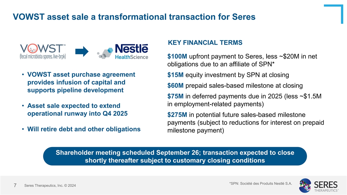 In connection with the proposed transaction involving Seres Therapeutics, Inc. (Seres) and Société des Produits Nestlé S.A. (SPN), Seres filed a definitive proxy statement with the Securities and Exchange Commission (the SEC). Seres may also file other relevant material with the SEC regarding the proposed transaction. Beginning on August 26, 2024, Seres mailed the definitive proxy statement to its stockholders. INVESTORS AND STOCKHOLDERS OF SERES ARE URGED TO READ THE DEFINITIVE PROXY STATEMENT AND OTHER RELEVANT MATERIALS CAREFULLY AND IN THEIR ENTIRETY WHEN THEY BECOME AVAILABLE BECAUSE THEY CONTAIN OR WILL CONTAIN IMPORTANT INFORMATION ABOUT SERES AND THE PROPOSED TRANSACTION. Investors may obtain a free copy of these materials (when they are available) and other documents filed by Seres with the SEC at the SECs website at www.sec.gov or from Seres at its website at ir.serestherapeutics.com.