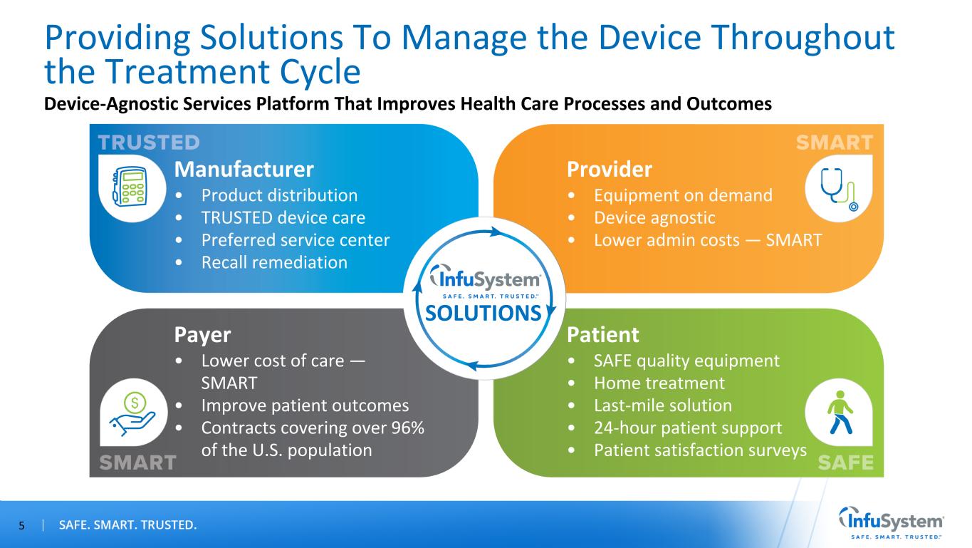 *Source: Newsweek, World's Best Hospitals 2024 4 Business Highlights A leading provider of medical equipment and patient services powered by a 100K+ device fleet in the U.S. and Canada Nearly four decades of experience, built on existing Oncology therapy model and now rapidly expanding into multiple therapies National scale, serving 18 out of 20 top-ranked hospital systems nationwide* Participating in-network provider in more than 800 health insurance networks covering over 96% of the U.S. population, serving over 2,450 sites of care Serving nearly 5,000 customer locations Seven major service areas in the U.S. and Canada with more than 500 employees