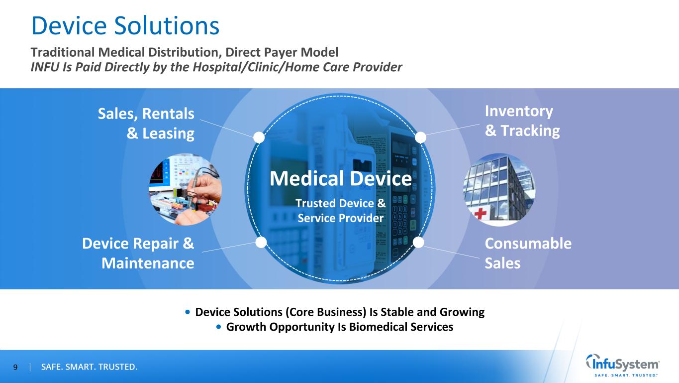 “The patient is at the center of everything we do.” Patient Services Oncology (Core Business) Is Profitable and Stable Growth Opportunities Are Pain Management and Wound Care Clinical Support/ Case Management Device Logistics Revenue Cycle Management Device Repair & Maintenance 8 Unique High-Service Platform, Third-Party Payer Model INFU Is Paid by the Patient’s Insurance Provider