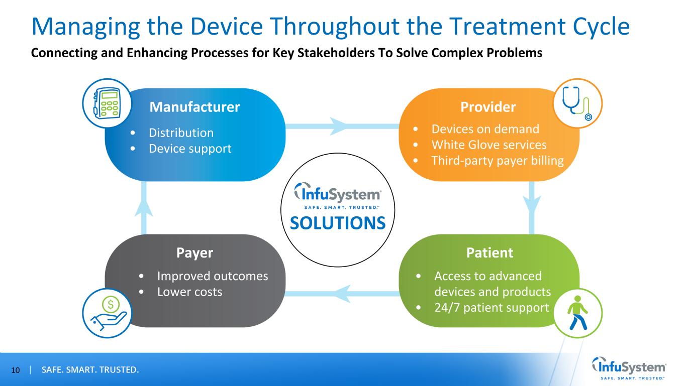 Medical Device Sales, Rentals & Leasing Consumable Sales Device Repair & Maintenance Device Solutions Traditional Medical Distribution, Direct Payer Model INFU Is Paid Directly by the Hospital/Clinic/Home Care Provider Trusted Device & Service Provider Inventory & Tracking • Device Solutions (Core Business) Is Stable and Growing • Growth Opportunity Is Biomedical Services 9