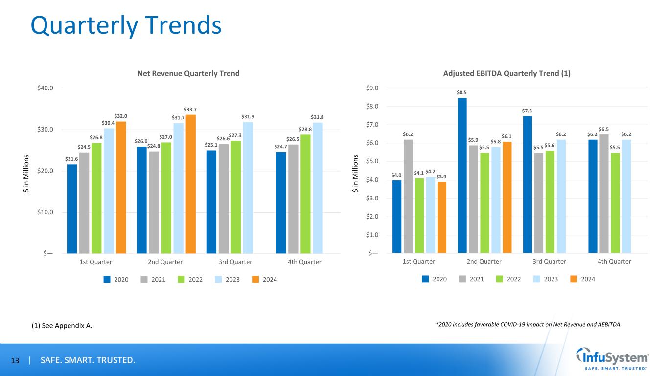 InfuSystem's Unique Capabilities Are in High Demand February 2021 Acquired and Integrated Two Biomedical Services Companies to Develop and Expand Device Solutions in Acute Care February 2022 Signed Agreement With Solo-Dex Inc. for Proprietary Continuous Peripheral Nerve Block Catheters April 2022 Biomedical Master Service Agreement With Leading Global Health Care Technology and Diagnostics Company – 300K Pumps, 1,200 Medical Facilities, 800 Hospitals 2021 2022 November 2022 Established New Wound Care Partnership With Sanara MedTech to Deliver a Complete Wound Care Solution Distribution Agreement With Cork Medical to Distribute NPWT Devices and Supplies 2023 April 2023 Announced National Distribution Agreement With Genadyne Biotechnologies to Distribute NPWT Systems and Supplies 12 February 2020 Launched Negative Pressure Wound Therapy (NPWT) to Provide Last-Mile Solution 2020 2024 August 2024 Announced Distribution Agreement With Smith+Nephew to Distribute Its Innovative RENASYS◊ EDGE NPWT System and Supplies September 2024 InfuSystem Holdings, Inc. and Sanara MedTech Inc. Announced Exclusive U.S. Distribution Agreement with ChemoMouthpiece, LLC