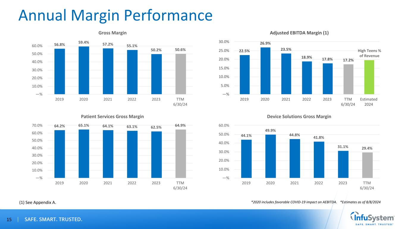 Annual Financial Performance 14 $ in M ill io ns $ in M ill io ns Net Revenues $81.1 $97.4 $102.4 $109.9 $125.8 $129.4 $134.2 2019 2020 2021 2022 2023 TTM 6/30/24 Estimated 2024 $— $20.0 $40.0 $60.0 $80.0 $100.0 $120.0 $140.0 $160.0 Adjusted EBITDA (1) $18.2 $26.2 $24.0 $20.7 $22.4 $22.3 $26.5 2019 2020 2021 2022 2023 TTM 6/30/24 Estimated 2024 $— $5.0 $10.0 $15.0 $20.0 $25.0 $30.0 Patient Services Net Revenues $51.5 $61.1 $65.6 $68.9 $76.5 $77.3 2019 2020 2021 2022 2023 TTM 6/30/24 $— $10.0 $20.0 $30.0 $40.0 $50.0 $60.0 $70.0 $80.0 $90.0 Device Solutions Net Revenues $29.6 $36.3 $36.8 $41.0 $49.3 $52.1 2019 2020 2021 2022 2023 TTM 6/30/24 $— $5.0 $10.0 $15.0 $20.0 $25.0 $30.0 $35.0 $40.0 $45.0 $50.0 $55.0 (1) See Appendix A. $ in M ill io ns $ in M ill io ns *Estimates as of 8/8/2024*2020 includes favorable COVID-19 impact on Net Revenue and AEBITDA. High Single Digit % Growth High Teens % of Revenue
