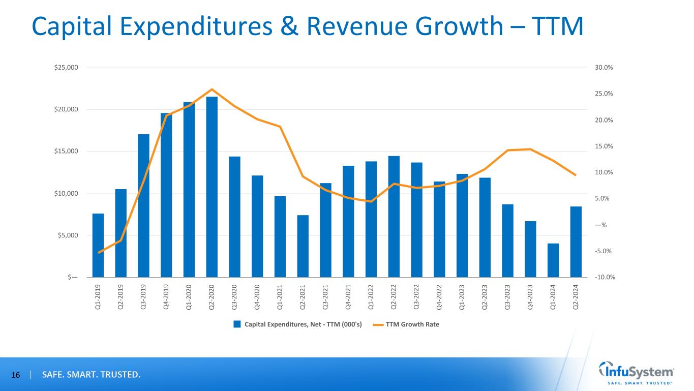 Annual Margin Performance 15 Gross Margin 56.8% 59.4% 57.2% 55.1% 50.2% 50.6% 2019 2020 2021 2022 2023 TTM 6/30/24 —% 10.0% 20.0% 30.0% 40.0% 50.0% 60.0% Adjusted EBITDA Margin (1) 22.5% 26.9% 23.5% 18.9% 17.8% 17.2% 19.7% 2019 2020 2021 2022 2023 TTM 6/30/24 Estimated 2024 —% 5.0% 10.0% 15.0% 20.0% 25.0% 30.0% Patient Services Gross Margin 64.2% 65.1% 64.1% 63.1% 62.5% 64.9% 2019 2020 2021 2022 2023 TTM 6/30/24 —% 10.0% 20.0% 30.0% 40.0% 50.0% 60.0% 70.0% Device Solutions Gross Margin 44.1% 49.9% 44.8% 41.8% 31.1% 29.4% 2019 2020 2021 2022 2023 TTM 6/30/24 —% 10.0% 20.0% 30.0% 40.0% 50.0% 60.0% (1) See Appendix A. *Estimates as of 8/8/2024*2020 includes favorable COVID-19 impact on AEBITDA. High Teens % of Revenue