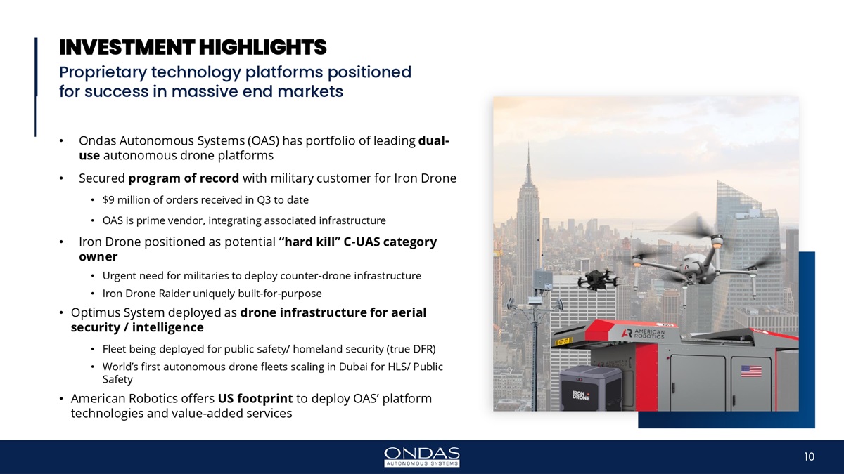 OAS T I MELI NE OAS established as an independent growth platform 2 0 14 2 0 16 2 0 15 20 2 1 2 0 24 Air o b o t ics Founded American Robotics Founded 2 0 23 Ondas Autonomous Systems Inc. (OAS) Established Airobotics Acquired by Ondas (January) I r on Dr o n e Founded Iron Drone Acquired by Ondas (March) E x p an d s Lan d m ark DFR Fleet Operations in Dubai (August) Iron Drone Military Development Accelerates (November) $4.5 Million in O A S W ar r an t s I ss u ed (February) Military Customer Development Order ($1.0 million) ( J u ly & A u gus t ) Military Vendor Development Order for Iron Drone (May) American Robotics Executes USCG Program (August) Iron Drone Order for Live Combat Operations ($8 million) (September) 8 American Robotics Acquired by Ondas (August) Gaza War begins (October) Optimus receives FAA T y p e C e r t if ic a t e (September) OAS TAM expanded dramatically in 2024 with defense sector engagement