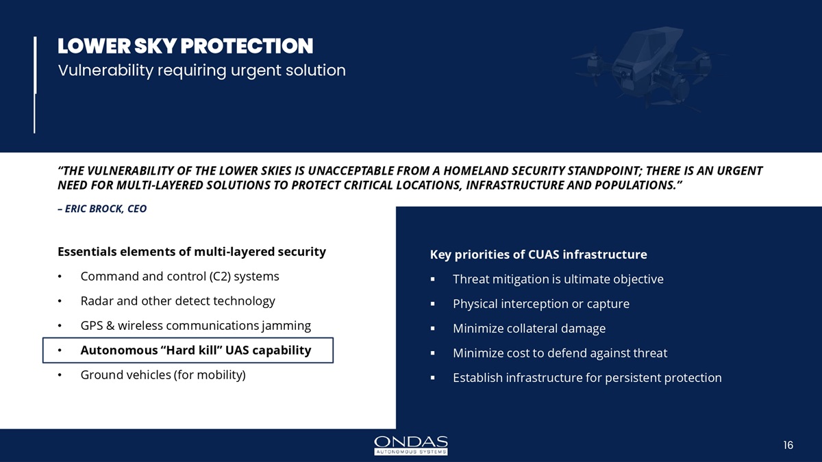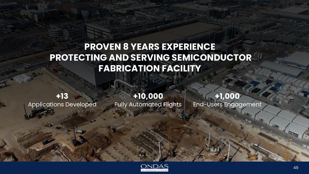 This presentation may contain "forward - looking statements" as that term is defined under the Private Securities Litigation Reform Act of 1995 (PSLRA), which statements may be identified by words such as "expects," "projects," "will," "may," "anticipates," "believes," "should," "intends," "estimates," and other words of similar meaning . Ondas Holdings Inc . (“Ondas” or the “Company”) cautions readers that forward - looking statements are predictions based on its current expectations about future events . These forward - looking statements are not guarantees of future performance and are subject to risks, uncertainties and assumptions that are difficult to predict . The Company’s actual results, performance, or achievements could differ materially from those expressed or implied by the forward - looking statements as a result of a number of factors, including, the risks discussed under the heading “Risk Factors” in the Company’s most recent Annual Report on Form 10 - K filed with the U . S . Securities and Exchange Commission (“SEC”), in the Company’s Quarterly Reports on Form 10 - Q filed with the SEC, and in the Company’s other filings with the SEC . The Company undertakes no obligation to publicly update or revise any forward - looking statements, whether as a result of new information, future events or otherwise that occur after that date, except as required by law . This presentation also contains estimates and other information concerning our industry that are based on industry publications, surveys and forecasts . This information involves a number of assumptions and limitations, and we have not independently verified the accuracy or completeness of the information . Non - GAAP Financial Measure As required by the rules of the Securities and Exchange Commission (“SEC"), we provide a reconciliation of EBITDA, the non - GAAP financial measure, contained in this presentation to the most directly comparable measure under GAAP . We believe that EBITDA facilitates analysis of our ongoing business operations because it excludes items that may not be reflective of, or are unrelated to, the Company’s core operating performance, and may assist investors with comparisons to prior periods and assessing trends in our underlying businesses . Other companies may calculate EBITDA differently, and therefore our measures may not be comparable to similarly titled measures used by other companies EBITDA should only be used as supplemental measures of our operating performance . We believe that EBITDA improves comparability from period to period by removing the impact of our capital structure (interest and financing expenses), asset base (depreciation and amortization), tax impacts and other adjustments, which management has determined are not reflective of core operating activities and thereby assist investors with assessing trends in our underlying businesses . Management uses EBITDA in making financial, operating and planning decisions and evaluating the Company's ongoing performance . With respect to our financial target for 2029 for EBITDA a reconciliation of this non - GAAP measure to the corresponding GAAP measure is not available without unreasonable effort due to the variability and complexity of the reconciling items described above that we exclude from this non - GAAP target measure . The variability of these items may have a significant impact on our future GAAP financial results and, as a result, we are unable to prepare the forward looking statement of income prepared in accordance with GAAP, that would be required to produce such a reconciliation . Disclaimer