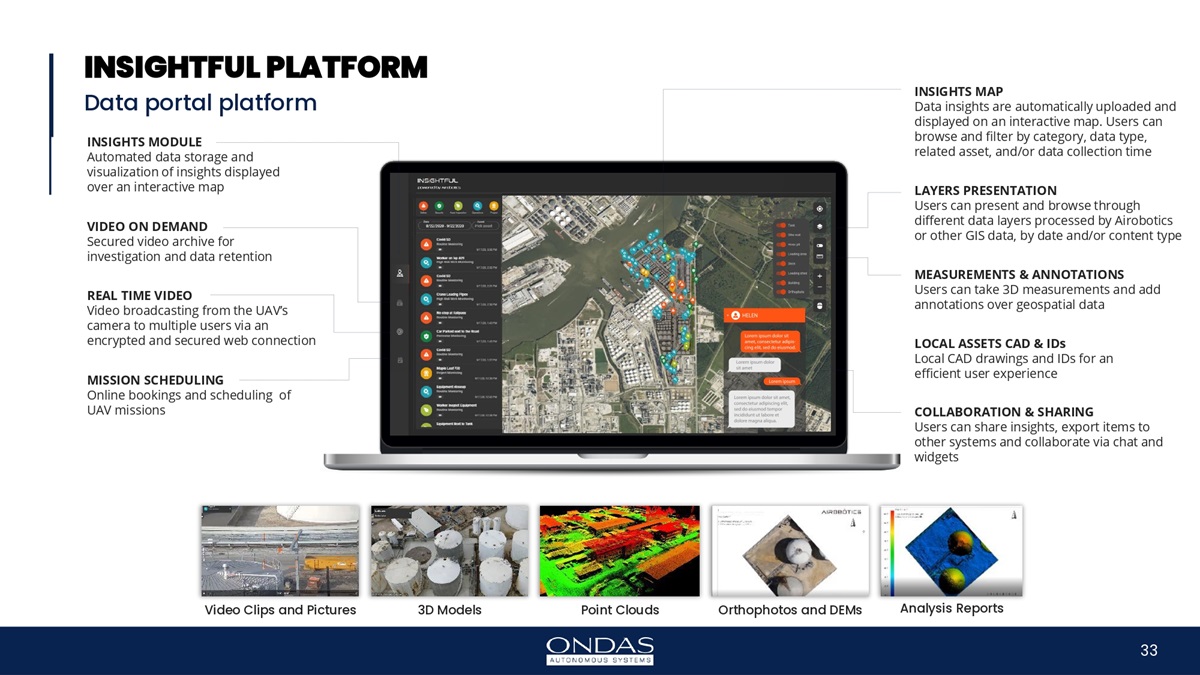 LAY E R S PRE S E N TA T I ON Users can present and browse through different data layers processed by Airobotics or o t h e r G IS da t a , by da t e and / or c on t e nt t yp e M E A S U RE M E N TS & A NN OT A T I O N S Users can take 3D measurements and add annotations over geospatial data LOCAL A SS E TS CA D & I D s Local CAD drawings and IDs for an efficient user experience I N S I G H TS M A P Data insights are automatically uploaded and displayed on an interactive map. Users can browse and filter by category, data type, related asset, and/or data collection time Automated data storage and visualization of insights displayed over an interactive map V I D E O ON D E M A N D Secured video archive for investigation and data retention RE A L T I M E V I D E O Video broadcasting from the UAV’s camera to multiple users via an encrypted and secured web connection M I SS I ON S C H E D U L I N G Online bookings and scheduling of UAV missions COL L A BOR A T I ON & S HA RI N G Users can share insights, export items to other systems and collaborate via chat and widgets Data portal platform I N S I G H TS M O D U LE Video Clips and Pictures 3 D Mo d els Orthophotos and DEMs P oin t Clouds Analysis Reports 33 INS I GHTFUL PLATF O RM