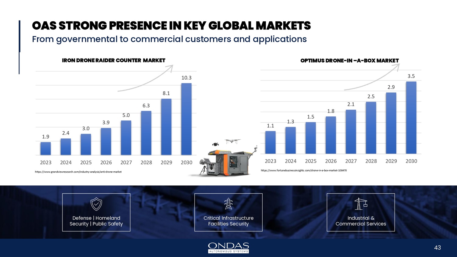 1.1 1.3 1.5 1.8 2.1 2.5 2.9 3.5 2 0 23 2 0 24 2 0 25 2 0 26 2 0 27 2 0 28 2 0 29 2 0 3 0 https:// www.fortunebusinessinsights.com/drone - in - a - box - market - 108470 O P T I MU S D RO N E - I N – A - BOX M A RK E T D e f e n s e | H o m e l and S e c ur i ty | Pu b li c Sa f e ty Industrial & Co m m e r c i a l S e r v i c e s Critical Infrastructure Facilities Security 1.9 2.4 3 .0 3.9 5.0 6.3 8.1 1 0 .3 I R O N DR O N E R A I DE R CO U N T E R M A RKE T 2 0 23 2 0 24 2 0 25 2 0 26 2 0 27 2 0 28 2 0 29 2 0 30 https:// www.grandviewresearch.com/industry - analysis/anti - drone - market OAS STRONG PRES E NCE IN KEY G L OBAL MARKETS From governmental to commercial customers and applications 43