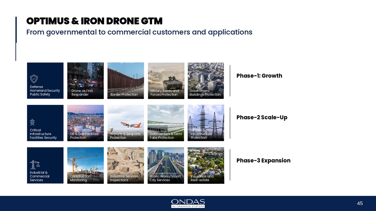 FULLY AUTONOMOUS DRONES: STEP - BY - STEP APPROACH Go - to - market plan is focusing on mature segments first Re g u l a t o r y / Cu s t omer Readiness P has e - 1 : G ro w t h P has e - 2 S c a l e - Up P has e - 3 Expa n s i o n O p er a t i ons Criticality L i f e S av i ng Public Sustainability Business Efficiency H i gh M e d i um Low D e f e nse | Hom e l and S e c ur i ty | Pu b li c Sa f e ty Critical Infrastructure Facilities Security Industrial & Co m m e r c i a l S e r v i c e s 44