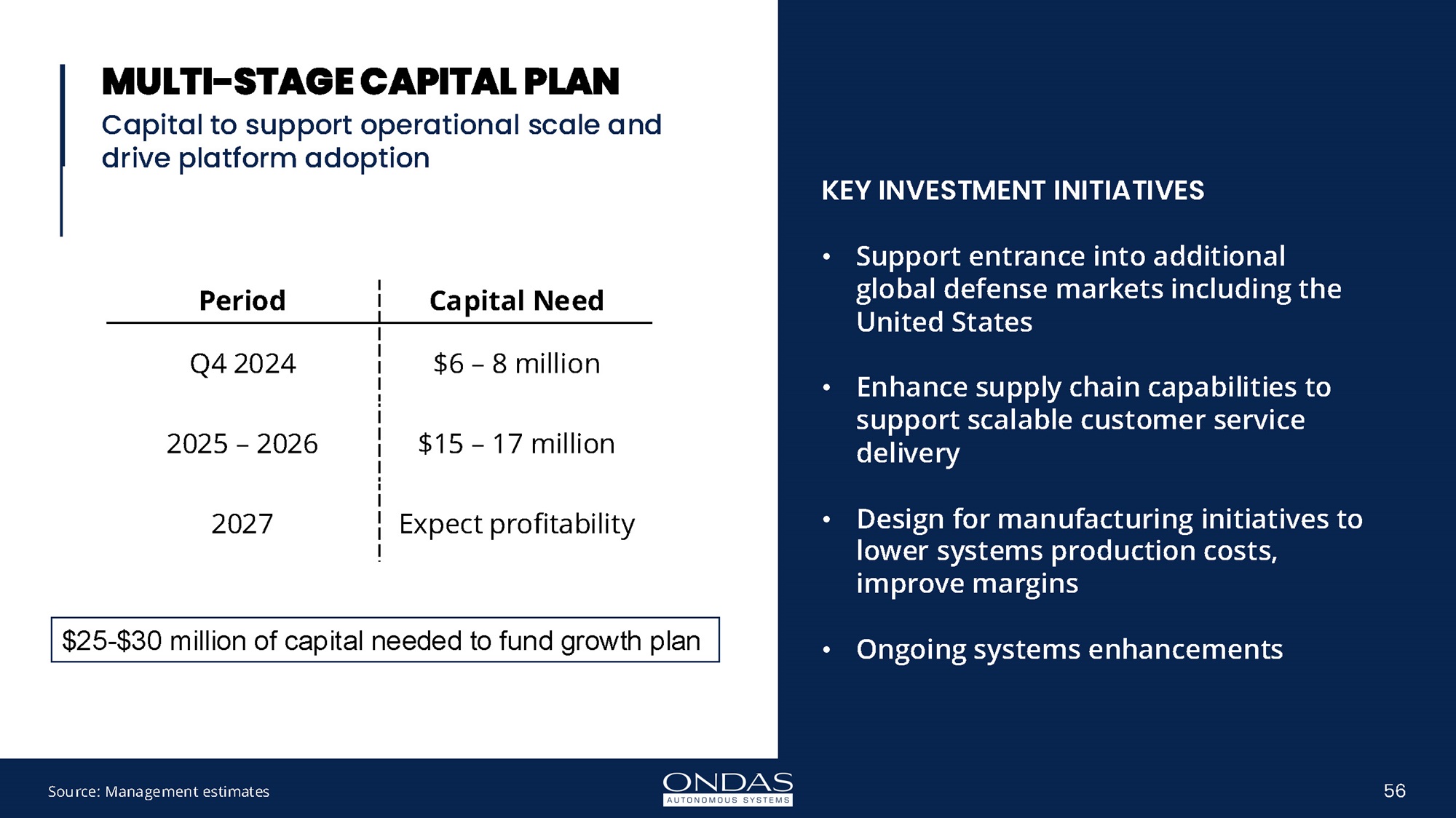 REVENUE O U TLO O K Capital to support operational scale and drive platform adoption Revenue Target Period $6 – 8 million 2H 2024 $15 – 18 million 2025 $35 – 38 million 2026 K EY FINANCIA L INS IGHTS - Outlook reflects conservative assumptions of obtainable market (SOM) - Operational investments support high growth, high margin GTM plan - E B IT D A po si ti v e ta r g e te d f o r H2 2026 - 2024 reflects impact of Gaza War; expect 2H recovery - Expect defense and public safety customers to drive g r o w t h o utl o o k f o r n e x t 12 – 18 mo n ths - Identified upside to forecasts across both Optimus and Iron Drone platforms; massive TAM supports upside to forecast over long - term - G2G military sales including the U.S. DoD represents significant opportunity not currently modeled - Faster investment in U.S. and Europe could pull forward growth into 2025 and 2026 55 Source: Management estimates