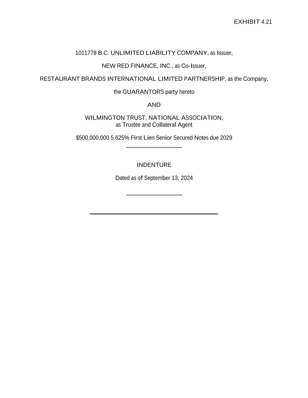 EXHIBIT 4.21 1011778 B.C. UNLIMITED LIABILITY COMPANY, as Issuer, NEW RED FINANCE, INC., as Co-Issuer, RESTAURANT BRANDS INTERNATIONAL LIMITED PARTNERSHIP, as the Company, the GUARANTORS party hereto AND WILMINGTON TRUST, NATIONAL ASSOCIATION, as Trustee and Collateral Agent $500,000,000 5.625% First Lien Senior Secured Notes due 2029 INDENTURE Dated as of September 13, 2024