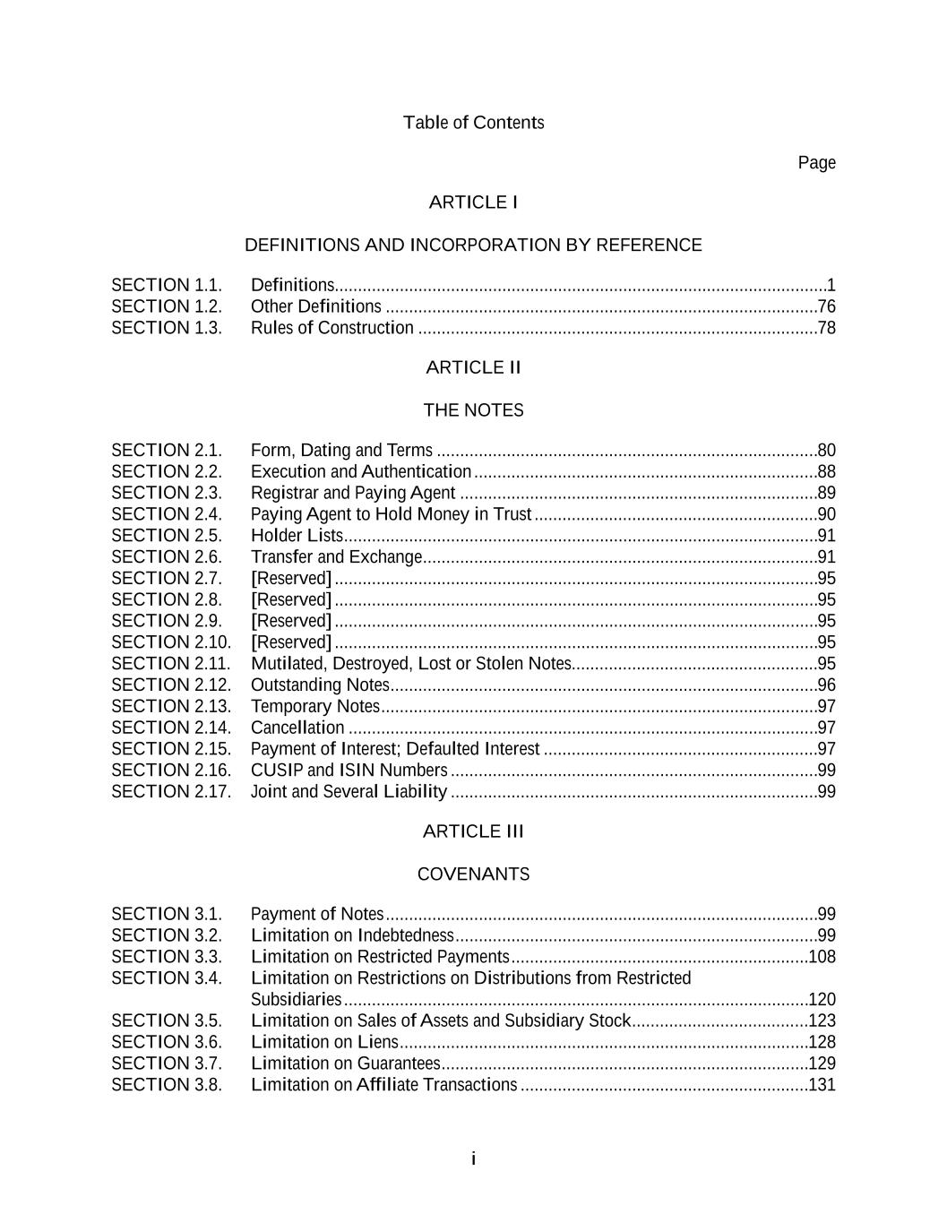 i Table of Contents Page ARTICLE I DEFINITIONS AND INCORPORATION BY REFERENCE SECTION 1.1. Definitions..........................................................................................................1 SECTION 1.2. Other Definitions .............................................................................................76 SECTION 1.3. Rules of Construction ......................................................................................78 ARTICLE II THE NOTES SECTION 2.1. Form, Dating and Terms ..................................................................................80 SECTION 2.2. Execution and Authentication ..........................................................................88 SECTION 2.3. Registrar and Paying Agent .............................................................................89 SECTION 2.4. Paying Agent to Hold Money in Trust .............................................................90 SECTION 2.5. Holder Lists ......................................................................................................91 SECTION 2.6. Transfer and Exchange .....................................................................................91 SECTION 2.7. [Reserved] ........................................................................................................95 SECTION 2.8. [Reserved] ........................................................................................................95 SECTION 2.9. [Reserved] ........................................................................................................95 SECTION 2.10. [Reserved] ........................................................................................................95 SECTION 2.11. Mutilated, Destroyed, Lost or Stolen Notes.....................................................95 SECTION 2.12. Outstanding Notes ............................................................................................96 SECTION 2.13. Temporary Notes ..............................................................................................97 SECTION 2.14. Cancellation .....................................................................................................97 SECTION 2.15. Payment of Interest; Defaulted Interest ...........................................................97 SECTION 2.16. CUSIP and ISIN Numbers ...............................................................................99 SECTION 2.17. Joint and Several Liability ...............................................................................99 ARTICLE III COVENANTS SECTION 3.1. Payment of Notes .............................................................................................99 SECTION 3.2. Limitation on Indebtedness ..............................................................................99 SECTION 3.3. Limitation on Restricted Payments ................................................................108 SECTION 3.4. Limitation on Restrictions on Distributions from Restricted Subsidiaries ....................................................................................................120 SECTION 3.5. Limitation on Sales of Assets and Subsidiary Stock ......................................123 SECTION 3.6. Limitation on Liens ........................................................................................128 SECTION 3.7. Limitation on Guarantees ...............................................................................129 SECTION 3.8. Limitation on Affiliate Transactions ..............................................................131