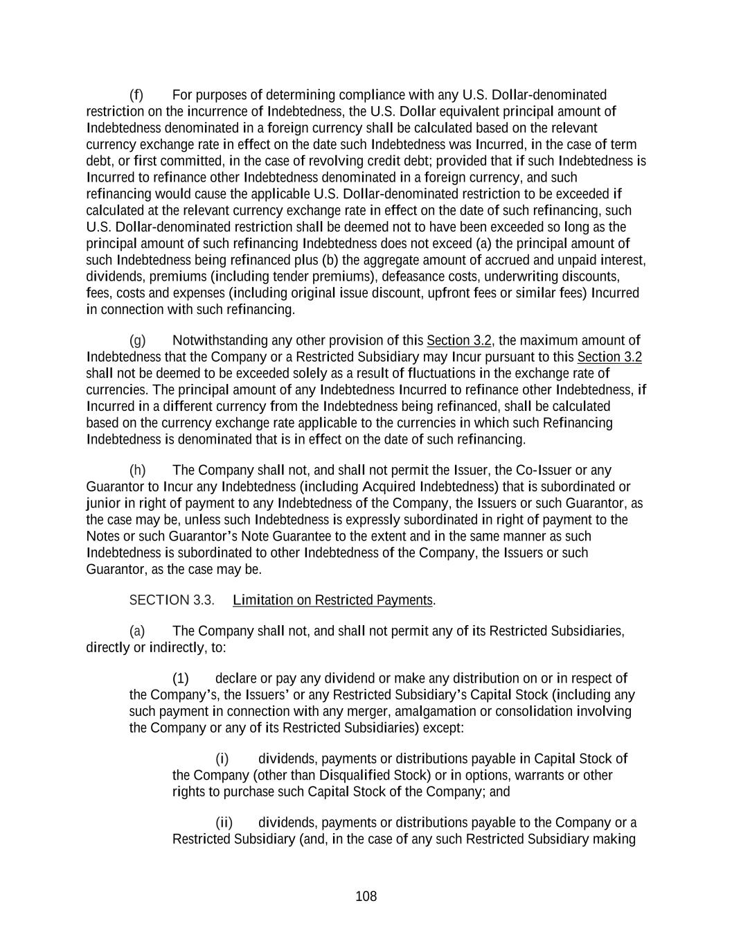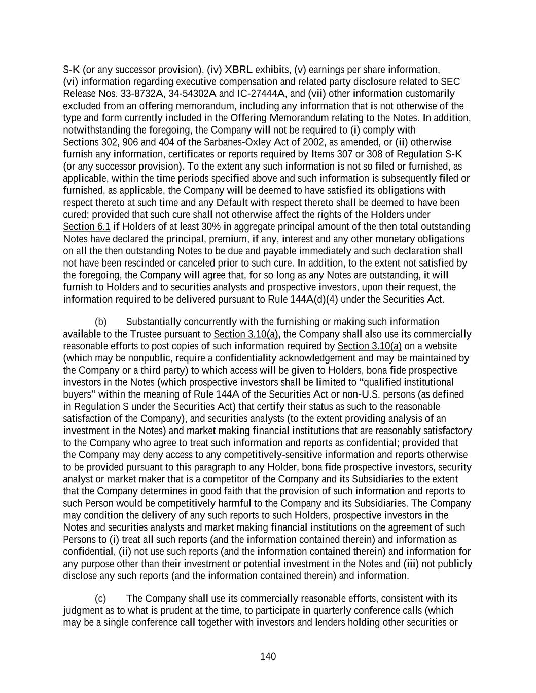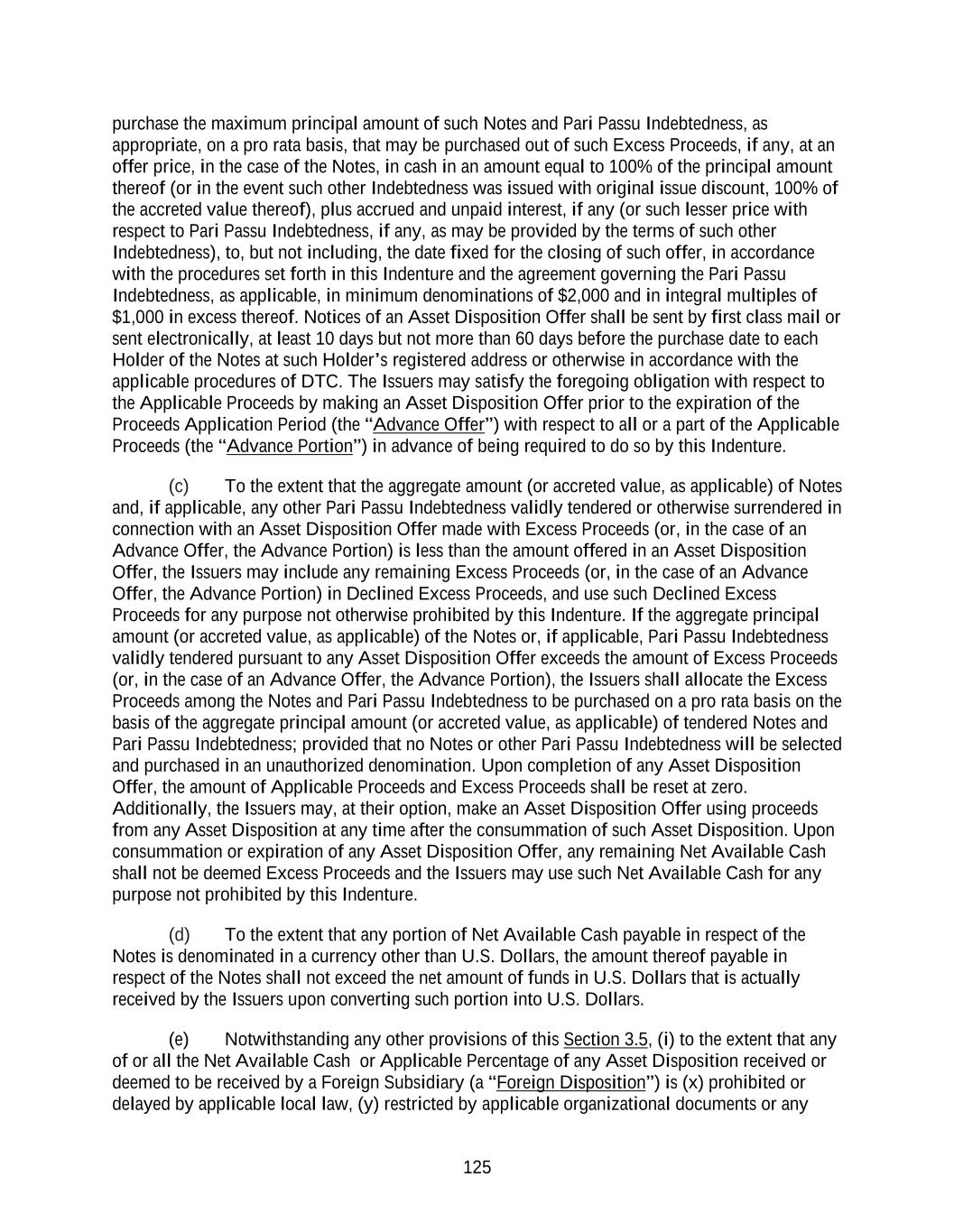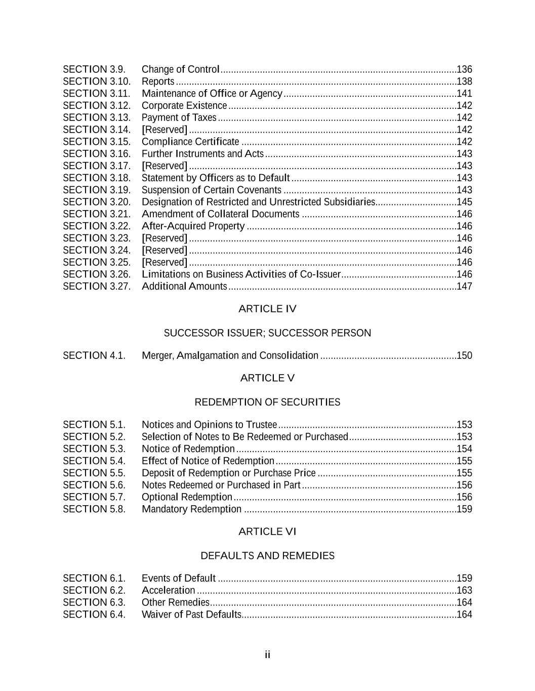 ii SECTION 3.9. Change of Control ..........................................................................................136 SECTION 3.10. Reports ...........................................................................................................138 SECTION 3.11. Maintenance of Office or Agency ..................................................................141 SECTION 3.12. Corporate Existence .......................................................................................142 SECTION 3.13. Payment of Taxes ...........................................................................................142 SECTION 3.14. [Reserved] ......................................................................................................142 SECTION 3.15. Compliance Certificate ..................................................................................142 SECTION 3.16. Further Instruments and Acts .........................................................................143 SECTION 3.17. [Reserved] ......................................................................................................143 SECTION 3.18. Statement by Officers as to Default ...............................................................143 SECTION 3.19. Suspension of Certain Covenants ..................................................................143 SECTION 3.20. Designation of Restricted and Unrestricted Subsidiaries...............................145 SECTION 3.21. Amendment of Collateral Documents ...........................................................146 SECTION 3.22. After-Acquired Property ................................................................................146 SECTION 3.23. [Reserved] ......................................................................................................146 SECTION 3.24. [Reserved] ......................................................................................................146 SECTION 3.25. [Reserved] ......................................................................................................146 SECTION 3.26. Limitations on Business Activities of Co-Issuer ............................................146 SECTION 3.27. Additional Amounts .......................................................................................147 ARTICLE IV SUCCESSOR ISSUER; SUCCESSOR PERSON SECTION 4.1. Merger, Amalgamation and Consolidation ....................................................150 ARTICLE V REDEMPTION OF SECURITIES SECTION 5.1. Notices and Opinions to Trustee ....................................................................153 SECTION 5.2. Selection of Notes to Be Redeemed or Purchased .........................................153 SECTION 5.3. Notice of Redemption ....................................................................................154 SECTION 5.4. Effect of Notice of Redemption .....................................................................155 SECTION 5.5. Deposit of Redemption or Purchase Price .....................................................155 SECTION 5.6. Notes Redeemed or Purchased in Part ...........................................................156 SECTION 5.7. Optional Redemption .....................................................................................156 SECTION 5.8. Mandatory Redemption .................................................................................159 ARTICLE VI DEFAULTS AND REMEDIES SECTION 6.1. Events of Default ...........................................................................................159 SECTION 6.2. Acceleration ...................................................................................................163 SECTION 6.3. Other Remedies ..............................................................................................164 SECTION 6.4. Waiver of Past Defaults..................................................................................164