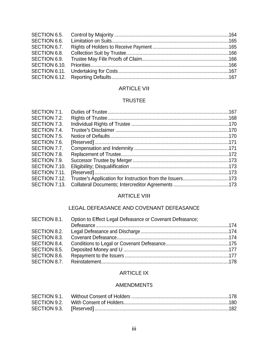 iii SECTION 6.5. Control by Majority .......................................................................................164 SECTION 6.6. Limitation on Suits .........................................................................................165 SECTION 6.7. Rights of Holders to Receive Payment ..........................................................165 SECTION 6.8. Collection Suit by Trustee ..............................................................................166 SECTION 6.9. Trustee May File Proofs of Claim ..................................................................166 SECTION 6.10. Priorities .........................................................................................................166 SECTION 6.11. Undertaking for Costs ....................................................................................167 SECTION 6.12. Reporting Defaults .........................................................................................167 ARTICLE VII TRUSTEE SECTION 7.1. Duties of Trustee ............................................................................................167 SECTION 7.2. Rights of Trustee ............................................................................................168 SECTION 7.3. Individual Rights of Trustee ..........................................................................170 SECTION 7.4. Trustee’s Disclaimer ......................................................................................170 SECTION 7.5. Notice of Defaults ..........................................................................................170 SECTION 7.6. [Reserved] ......................................................................................................171 SECTION 7.7. Compensation and Indemnity ........................................................................171 SECTION 7.8. Replacement of Trustee..................................................................................172 SECTION 7.9. Successor Trustee by Merger .........................................................................173 SECTION 7.10. Eligibility; Disqualification ...........................................................................173 SECTION 7.11. [Reserved] ......................................................................................................173 SECTION 7.12. Trustee’s Application for Instruction from the Issuers ...................................173 SECTION 7.13. Collateral Documents; Intercreditor Agreements ..........................................173 ARTICLE VIII LEGAL DEFEASANCE AND COVENANT DEFEASANCE SECTION 8.1. Option to Effect Legal Defeasance or Covenant Defeasance; Defeasance .....................................................................................................174 SECTION 8.2. Legal Defeasance and Discharge ...................................................................174 SECTION 8.3. Covenant Defeasance .....................................................................................174 SECTION 8.4. Conditions to Legal or Covenant Defeasance ................................................175 SECTION 8.5. Deposited Money and U ................................................................................177 SECTION 8.6. Repayment to the Issuers ...............................................................................177 SECTION 8.7. Reinstatement .................................................................................................178 ARTICLE IX AMENDMENTS SECTION 9.1. Without Consent of Holders ..........................................................................178 SECTION 9.2. With Consent of Holders ................................................................................180 SECTION 9.3. [Reserved] ......................................................................................................182