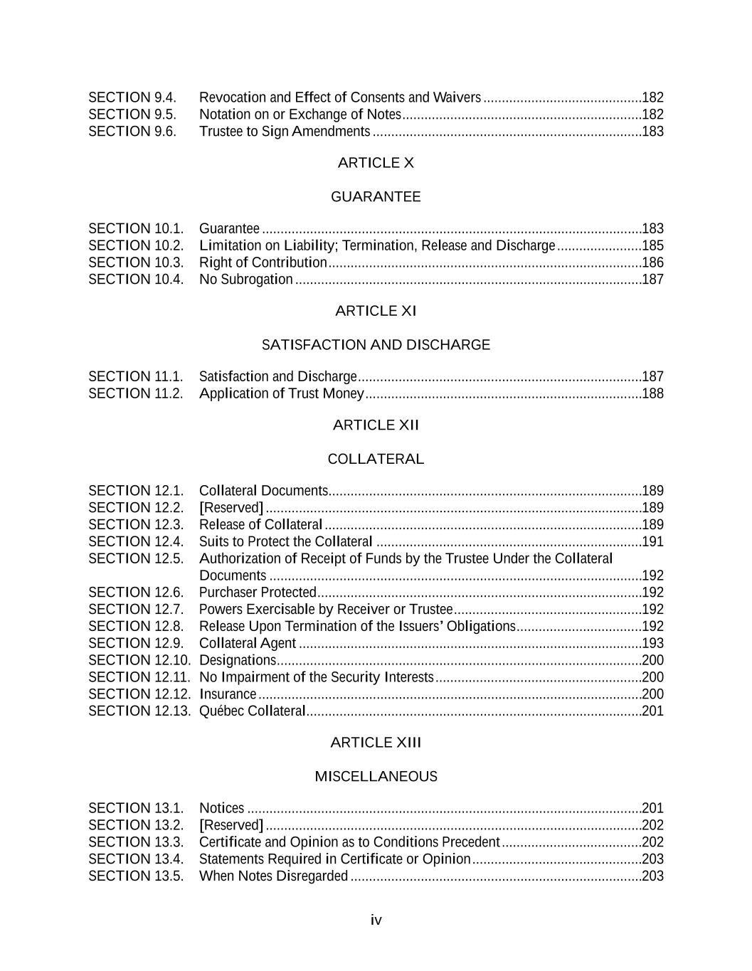 iv SECTION 9.4. Revocation and Effect of Consents and Waivers ...........................................182 SECTION 9.5. Notation on or Exchange of Notes .................................................................182 SECTION 9.6. Trustee to Sign Amendments .........................................................................183 ARTICLE X GUARANTEE SECTION 10.1. Guarantee .......................................................................................................183 SECTION 10.2. Limitation on Liability; Termination, Release and Discharge .......................185 SECTION 10.3. Right of Contribution .....................................................................................186 SECTION 10.4. No Subrogation ..............................................................................................187 ARTICLE XI SATISFACTION AND DISCHARGE SECTION 11.1. Satisfaction and Discharge .............................................................................187 SECTION 11.2. Application of Trust Money ...........................................................................188 ARTICLE XII COLLATERAL SECTION 12.1. Collateral Documents.....................................................................................189 SECTION 12.2. [Reserved] ......................................................................................................189 SECTION 12.3. Release of Collateral ......................................................................................189 SECTION 12.4. Suits to Protect the Collateral ........................................................................191 SECTION 12.5. Authorization of Receipt of Funds by the Trustee Under the Collateral Documents .....................................................................................................192 SECTION 12.6. Purchaser Protected ........................................................................................192 SECTION 12.7. Powers Exercisable by Receiver or Trustee ...................................................192 SECTION 12.8. Release Upon Termination of the Issuers’ Obligations ..................................192 SECTION 12.9. Collateral Agent .............................................................................................193 SECTION 12.10. Designations ...................................................................................................200 SECTION 12.11. No Impairment of the Security Interests ........................................................200 SECTION 12.12. Insurance ........................................................................................................200 SECTION 12.13. Québec Collateral...........................................................................................201 ARTICLE XIII MISCELLANEOUS SECTION 13.1. Notices ...........................................................................................................201 SECTION 13.2. [Reserved] ......................................................................................................202 SECTION 13.3. Certificate and Opinion as to Conditions Precedent ......................................202 SECTION 13.4. Statements Required in Certificate or Opinion ..............................................203 SECTION 13.5. When Notes Disregarded ...............................................................................203