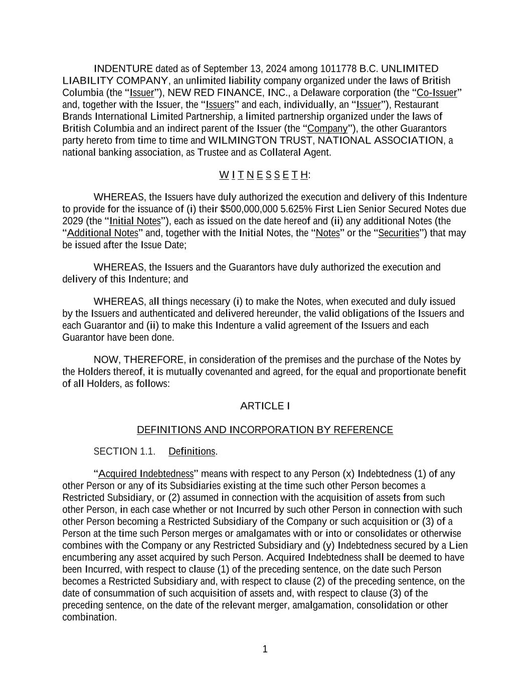 1 INDENTURE dated as of September 13, 2024 among 1011778 B.C. UNLIMITED LIABILITY COMPANY, an unlimited liability company organized under the laws of British Columbia (the “Issuer”), NEW RED FINANCE, INC., a Delaware corporation (the “Co-Issuer” and, together with the Issuer, the “Issuers” and each, individually, an “Issuer”), Restaurant Brands International Limited Partnership, a limited partnership organized under the laws of British Columbia and an indirect parent of the Issuer (the “Company”), the other Guarantors party hereto from time to time and WILMINGTON TRUST, NATIONAL ASSOCIATION, a national banking association, as Trustee and as Collateral Agent. W I T N E S S E T H: WHEREAS, the Issuers have duly authorized the execution and delivery of this Indenture to provide for the issuance of (i) their $500,000,000 5.625% First Lien Senior Secured Notes due 2029 (the “Initial Notes”), each as issued on the date hereof and (ii) any additional Notes (the “Additional Notes” and, together with the Initial Notes, the “Notes” or the “Securities”) that may be issued after the Issue Date; WHEREAS, the Issuers and the Guarantors have duly authorized the execution and delivery of this Indenture; and WHEREAS, all things necessary (i) to make the Notes, when executed and duly issued by the Issuers and authenticated and delivered hereunder, the valid obligations of the Issuers and each Guarantor and (ii) to make this Indenture a valid agreement of the Issuers and each Guarantor have been done. NOW, THEREFORE, in consideration of the premises and the purchase of the Notes by the Holders thereof, it is mutually covenanted and agreed, for the equal and proportionate benefit of all Holders, as follows: ARTICLE I DEFINITIONS AND INCORPORATION BY REFERENCE SECTION 1.1. Definitions. “Acquired Indebtedness” means with respect to any Person (x) Indebtedness (1) of any other Person or any of its Subsidiaries existing at the time such other Person becomes a Restricted Subsidiary, or (2) assumed in connection with the acquisition of assets from such other Person, in each case whether or not Incurred by such other Person in connection with such other Person becoming a Restricted Subsidiary of the Company or such acquisition or (3) of a Person at the time such Person merges or amalgamates with or into or consolidates or otherwise combines with the Company or any Restricted Subsidiary and (y) Indebtedness secured by a Lien encumbering any asset acquired by such Person. Acquired Indebtedness shall be deemed to have been Incurred, with respect to clause (1) of the preceding sentence, on the date such Person becomes a Restricted Subsidiary and, with respect to clause (2) of the preceding sentence, on the date of consummation of such acquisition of assets and, with respect to clause (3) of the preceding sentence, on the date of the relevant merger, amalgamation, consolidation or other combination.