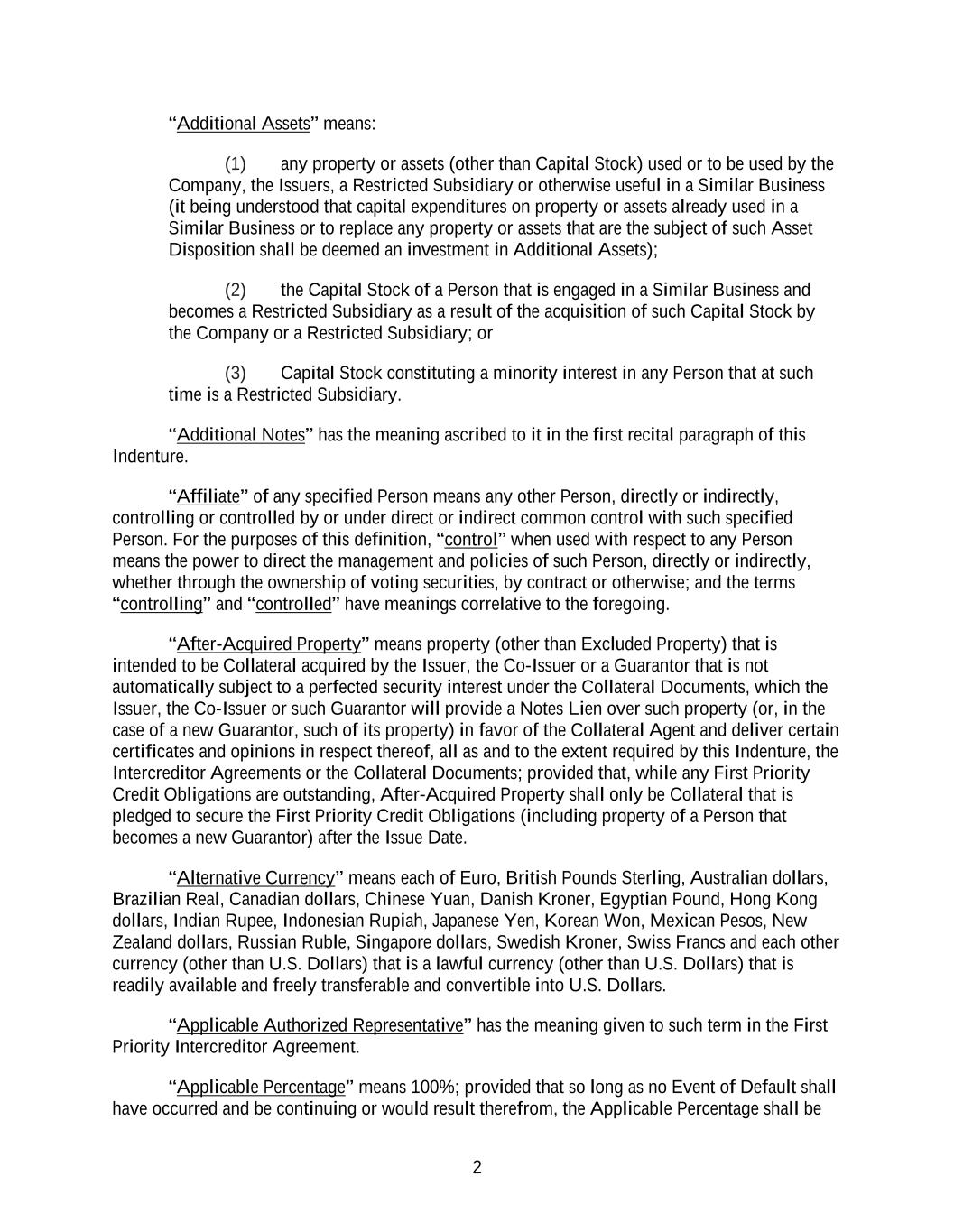2 “Additional Assets” means: (1) any property or assets (other than Capital Stock) used or to be used by the Company, the Issuers, a Restricted Subsidiary or otherwise useful in a Similar Business (it being understood that capital expenditures on property or assets already used in a Similar Business or to replace any property or assets that are the subject of such Asset Disposition shall be deemed an investment in Additional Assets); (2) the Capital Stock of a Person that is engaged in a Similar Business and becomes a Restricted Subsidiary as a result of the acquisition of such Capital Stock by the Company or a Restricted Subsidiary; or (3) Capital Stock constituting a minority interest in any Person that at such time is a Restricted Subsidiary. “Additional Notes” has the meaning ascribed to it in the first recital paragraph of this Indenture. “Affiliate” of any specified Person means any other Person, directly or indirectly, controlling or controlled by or under direct or indirect common control with such specified Person. For the purposes of this definition, “control” when used with respect to any Person means the power to direct the management and policies of such Person, directly or indirectly, whether through the ownership of voting securities, by contract or otherwise; and the terms “controlling” and “controlled” have meanings correlative to the foregoing. “After-Acquired Property” means property (other than Excluded Property) that is intended to be Collateral acquired by the Issuer, the Co-Issuer or a Guarantor that is not automatically subject to a perfected security interest under the Collateral Documents, which the Issuer, the Co-Issuer or such Guarantor will provide a Notes Lien over such property (or, in the case of a new Guarantor, such of its property) in favor of the Collateral Agent and deliver certain certificates and opinions in respect thereof, all as and to the extent required by this Indenture, the Intercreditor Agreements or the Collateral Documents; provided that, while any First Priority Credit Obligations are outstanding, After-Acquired Property shall only be Collateral that is pledged to secure the First Priority Credit Obligations (including property of a Person that becomes a new Guarantor) after the Issue Date. “Alternative Currency” means each of Euro, British Pounds Sterling, Australian dollars, Brazilian Real, Canadian dollars, Chinese Yuan, Danish Kroner, Egyptian Pound, Hong Kong dollars, Indian Rupee, Indonesian Rupiah, Japanese Yen, Korean Won, Mexican Pesos, New Zealand dollars, Russian Ruble, Singapore dollars, Swedish Kroner, Swiss Francs and each other currency (other than U.S. Dollars) that is a lawful currency (other than U.S. Dollars) that is readily available and freely transferable and convertible into U.S. Dollars. “Applicable Authorized Representative” has the meaning given to such term in the First Priority Intercreditor Agreement. “Applicable Percentage” means 100%; provided that so long as no Event of Default shall have occurred and be continuing or would result therefrom, the Applicable Percentage shall be