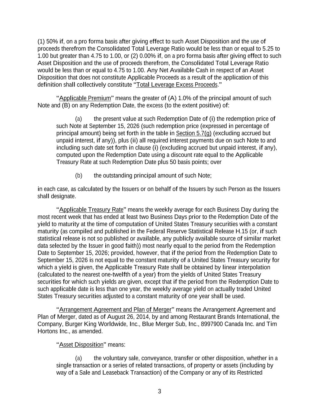 3 (1) 50% if, on a pro forma basis after giving effect to such Asset Disposition and the use of proceeds therefrom the Consolidated Total Leverage Ratio would be less than or equal to 5.25 to 1.00 but greater than 4.75 to 1.00, or (2) 0.00% if, on a pro forma basis after giving effect to such Asset Disposition and the use of proceeds therefrom, the Consolidated Total Leverage Ratio would be less than or equal to 4.75 to 1.00. Any Net Available Cash in respect of an Asset Disposition that does not constitute Applicable Proceeds as a result of the application of this definition shall collectively constitute “Total Leverage Excess Proceeds.” “Applicable Premium” means the greater of (A) 1.0% of the principal amount of such Note and (B) on any Redemption Date, the excess (to the extent positive) of: (a) the present value at such Redemption Date of (i) the redemption price of such Note at September 15, 2026 (such redemption price (expressed in percentage of principal amount) being set forth in the table in Section 5.7(g) (excluding accrued but unpaid interest, if any)), plus (ii) all required interest payments due on such Note to and including such date set forth in clause (i) (excluding accrued but unpaid interest, if any), computed upon the Redemption Date using a discount rate equal to the Applicable Treasury Rate at such Redemption Date plus 50 basis points; over (b) the outstanding principal amount of such Note; in each case, as calculated by the Issuers or on behalf of the Issuers by such Person as the Issuers shall designate. “Applicable Treasury Rate” means the weekly average for each Business Day during the most recent week that has ended at least two Business Days prior to the Redemption Date of the yield to maturity at the time of computation of United States Treasury securities with a constant maturity (as compiled and published in the Federal Reserve Statistical Release H.15 (or, if such statistical release is not so published or available, any publicly available source of similar market data selected by the Issuer in good faith)) most nearly equal to the period from the Redemption Date to September 15, 2026; provided, however, that if the period from the Redemption Date to September 15, 2026 is not equal to the constant maturity of a United States Treasury security for which a yield is given, the Applicable Treasury Rate shall be obtained by linear interpolation (calculated to the nearest one-twelfth of a year) from the yields of United States Treasury securities for which such yields are given, except that if the period from the Redemption Date to such applicable date is less than one year, the weekly average yield on actually traded United States Treasury securities adjusted to a constant maturity of one year shall be used. “Arrangement Agreement and Plan of Merger” means the Arrangement Agreement and Plan of Merger, dated as of August 26, 2014, by and among Restaurant Brands International, the Company, Burger King Worldwide, Inc., Blue Merger Sub, Inc., 8997900 Canada Inc. and Tim Hortons Inc., as amended. “Asset Disposition” means: (a) the voluntary sale, conveyance, transfer or other disposition, whether in a single transaction or a series of related transactions, of property or assets (including by way of a Sale and Leaseback Transaction) of the Company or any of its Restricted