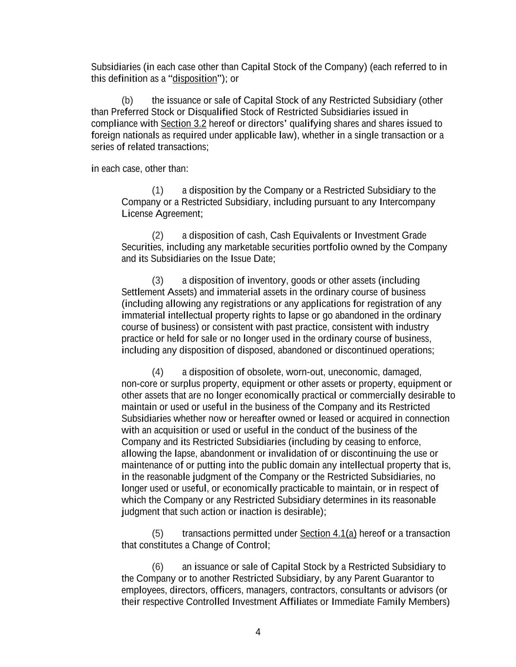 4 Subsidiaries (in each case other than Capital Stock of the Company) (each referred to in this definition as a “disposition”); or (b) the issuance or sale of Capital Stock of any Restricted Subsidiary (other than Preferred Stock or Disqualified Stock of Restricted Subsidiaries issued in compliance with Section 3.2 hereof or directors’ qualifying shares and shares issued to foreign nationals as required under applicable law), whether in a single transaction or a series of related transactions; in each case, other than: (1) a disposition by the Company or a Restricted Subsidiary to the Company or a Restricted Subsidiary, including pursuant to any Intercompany License Agreement; (2) a disposition of cash, Cash Equivalents or Investment Grade Securities, including any marketable securities portfolio owned by the Company and its Subsidiaries on the Issue Date; (3) a disposition of inventory, goods or other assets (including Settlement Assets) and immaterial assets in the ordinary course of business (including allowing any registrations or any applications for registration of any immaterial intellectual property rights to lapse or go abandoned in the ordinary course of business) or consistent with past practice, consistent with industry practice or held for sale or no longer used in the ordinary course of business, including any disposition of disposed, abandoned or discontinued operations; (4) a disposition of obsolete, worn-out, uneconomic, damaged, non-core or surplus property, equipment or other assets or property, equipment or other assets that are no longer economically practical or commercially desirable to maintain or used or useful in the business of the Company and its Restricted Subsidiaries whether now or hereafter owned or leased or acquired in connection with an acquisition or used or useful in the conduct of the business of the Company and its Restricted Subsidiaries (including by ceasing to enforce, allowing the lapse, abandonment or invalidation of or discontinuing the use or maintenance of or putting into the public domain any intellectual property that is, in the reasonable judgment of the Company or the Restricted Subsidiaries, no longer used or useful, or economically practicable to maintain, or in respect of which the Company or any Restricted Subsidiary determines in its reasonable judgment that such action or inaction is desirable); (5) transactions permitted under Section 4.1(a) hereof or a transaction that constitutes a Change of Control; (6) an issuance or sale of Capital Stock by a Restricted Subsidiary to the Company or to another Restricted Subsidiary, by any Parent Guarantor to employees, directors, officers, managers, contractors, consultants or advisors (or their respective Controlled Investment Affiliates or Immediate Family Members)