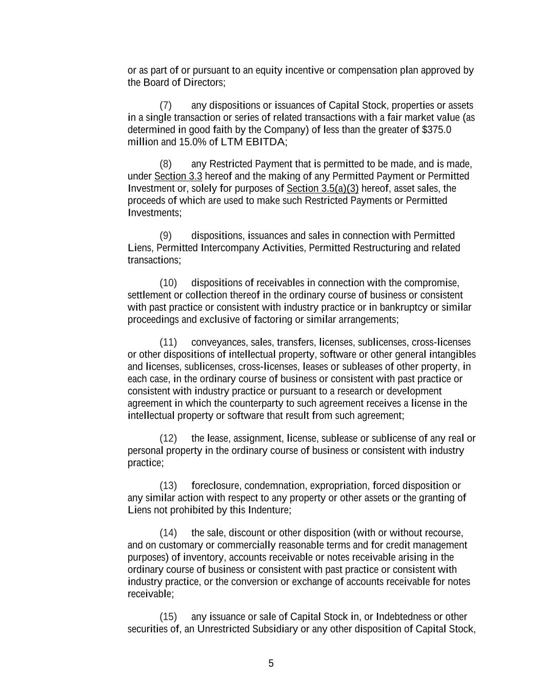 5 or as part of or pursuant to an equity incentive or compensation plan approved by the Board of Directors; (7) any dispositions or issuances of Capital Stock, properties or assets in a single transaction or series of related transactions with a fair market value (as determined in good faith by the Company) of less than the greater of $375.0 million and 15.0% of LTM EBITDA; (8) any Restricted Payment that is permitted to be made, and is made, under Section 3.3 hereof and the making of any Permitted Payment or Permitted Investment or, solely for purposes of Section 3.5(a)(3) hereof, asset sales, the proceeds of which are used to make such Restricted Payments or Permitted Investments; (9) dispositions, issuances and sales in connection with Permitted Liens, Permitted Intercompany Activities, Permitted Restructuring and related transactions; (10) dispositions of receivables in connection with the compromise, settlement or collection thereof in the ordinary course of business or consistent with past practice or consistent with industry practice or in bankruptcy or similar proceedings and exclusive of factoring or similar arrangements; (11) conveyances, sales, transfers, licenses, sublicenses, cross-licenses or other dispositions of intellectual property, software or other general intangibles and licenses, sublicenses, cross-licenses, leases or subleases of other property, in each case, in the ordinary course of business or consistent with past practice or consistent with industry practice or pursuant to a research or development agreement in which the counterparty to such agreement receives a license in the intellectual property or software that result from such agreement; (12) the lease, assignment, license, sublease or sublicense of any real or personal property in the ordinary course of business or consistent with industry practice; (13) foreclosure, condemnation, expropriation, forced disposition or any similar action with respect to any property or other assets or the granting of Liens not prohibited by this Indenture; (14) the sale, discount or other disposition (with or without recourse, and on customary or commercially reasonable terms and for credit management purposes) of inventory, accounts receivable or notes receivable arising in the ordinary course of business or consistent with past practice or consistent with industry practice, or the conversion or exchange of accounts receivable for notes receivable; (15) any issuance or sale of Capital Stock in, or Indebtedness or other securities of, an Unrestricted Subsidiary or any other disposition of Capital Stock,