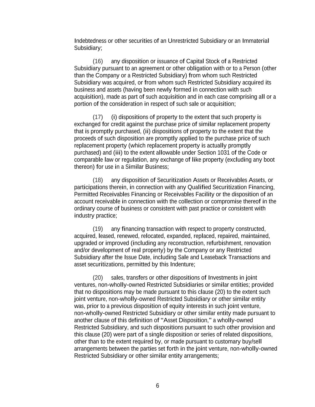 6 Indebtedness or other securities of an Unrestricted Subsidiary or an Immaterial Subsidiary; (16) any disposition or issuance of Capital Stock of a Restricted Subsidiary pursuant to an agreement or other obligation with or to a Person (other than the Company or a Restricted Subsidiary) from whom such Restricted Subsidiary was acquired, or from whom such Restricted Subsidiary acquired its business and assets (having been newly formed in connection with such acquisition), made as part of such acquisition and in each case comprising all or a portion of the consideration in respect of such sale or acquisition; (17) (i) dispositions of property to the extent that such property is exchanged for credit against the purchase price of similar replacement property that is promptly purchased, (ii) dispositions of property to the extent that the proceeds of such disposition are promptly applied to the purchase price of such replacement property (which replacement property is actually promptly purchased) and (iii) to the extent allowable under Section 1031 of the Code or comparable law or regulation, any exchange of like property (excluding any boot thereon) for use in a Similar Business; (18) any disposition of Securitization Assets or Receivables Assets, or participations therein, in connection with any Qualified Securitization Financing, Permitted Receivables Financing or Receivables Facility or the disposition of an account receivable in connection with the collection or compromise thereof in the ordinary course of business or consistent with past practice or consistent with industry practice; (19) any financing transaction with respect to property constructed, acquired, leased, renewed, relocated, expanded, replaced, repaired, maintained, upgraded or improved (including any reconstruction, refurbishment, renovation and/or development of real property) by the Company or any Restricted Subsidiary after the Issue Date, including Sale and Leaseback Transactions and asset securitizations, permitted by this Indenture; (20) sales, transfers or other dispositions of Investments in joint ventures, non-wholly-owned Restricted Subsidiaries or similar entities; provided that no dispositions may be made pursuant to this clause (20) to the extent such joint venture, non-wholly-owned Restricted Subsidiary or other similar entity was, prior to a previous disposition of equity interests in such joint venture, non-wholly-owned Restricted Subsidiary or other similar entity made pursuant to another clause of this definition of “Asset Disposition,” a wholly-owned Restricted Subsidiary, and such dispositions pursuant to such other provision and this clause (20) were part of a single disposition or series of related dispositions, other than to the extent required by, or made pursuant to customary buy/sell arrangements between the parties set forth in the joint venture, non-wholly-owned Restricted Subsidiary or other similar entity arrangements;
