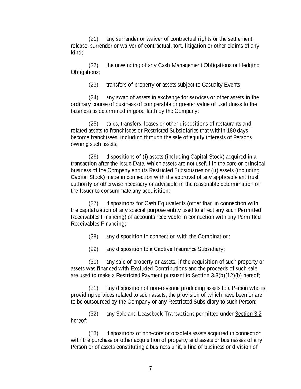 7 (21) any surrender or waiver of contractual rights or the settlement, release, surrender or waiver of contractual, tort, litigation or other claims of any kind; (22) the unwinding of any Cash Management Obligations or Hedging Obligations; (23) transfers of property or assets subject to Casualty Events; (24) any swap of assets in exchange for services or other assets in the ordinary course of business of comparable or greater value of usefulness to the business as determined in good faith by the Company; (25) sales, transfers, leases or other dispositions of restaurants and related assets to franchisees or Restricted Subsidiaries that within 180 days become franchisees, including through the sale of equity interests of Persons owning such assets; (26) dispositions of (i) assets (including Capital Stock) acquired in a transaction after the Issue Date, which assets are not useful in the core or principal business of the Company and its Restricted Subsidiaries or (ii) assets (including Capital Stock) made in connection with the approval of any applicable antitrust authority or otherwise necessary or advisable in the reasonable determination of the Issuer to consummate any acquisition; (27) dispositions for Cash Equivalents (other than in connection with the capitalization of any special purpose entity used to effect any such Permitted Receivables Financing) of accounts receivable in connection with any Permitted Receivables Financing; (28) any disposition in connection with the Combination; (29) any disposition to a Captive Insurance Subsidiary; (30) any sale of property or assets, if the acquisition of such property or assets was financed with Excluded Contributions and the proceeds of such sale are used to make a Restricted Payment pursuant to Section 3.3(b)(12)(b) hereof; (31) any disposition of non-revenue producing assets to a Person who is providing services related to such assets, the provision of which have been or are to be outsourced by the Company or any Restricted Subsidiary to such Person; (32) any Sale and Leaseback Transactions permitted under Section 3.2 hereof; (33) dispositions of non-core or obsolete assets acquired in connection with the purchase or other acquisition of property and assets or businesses of any Person or of assets constituting a business unit, a line of business or division of