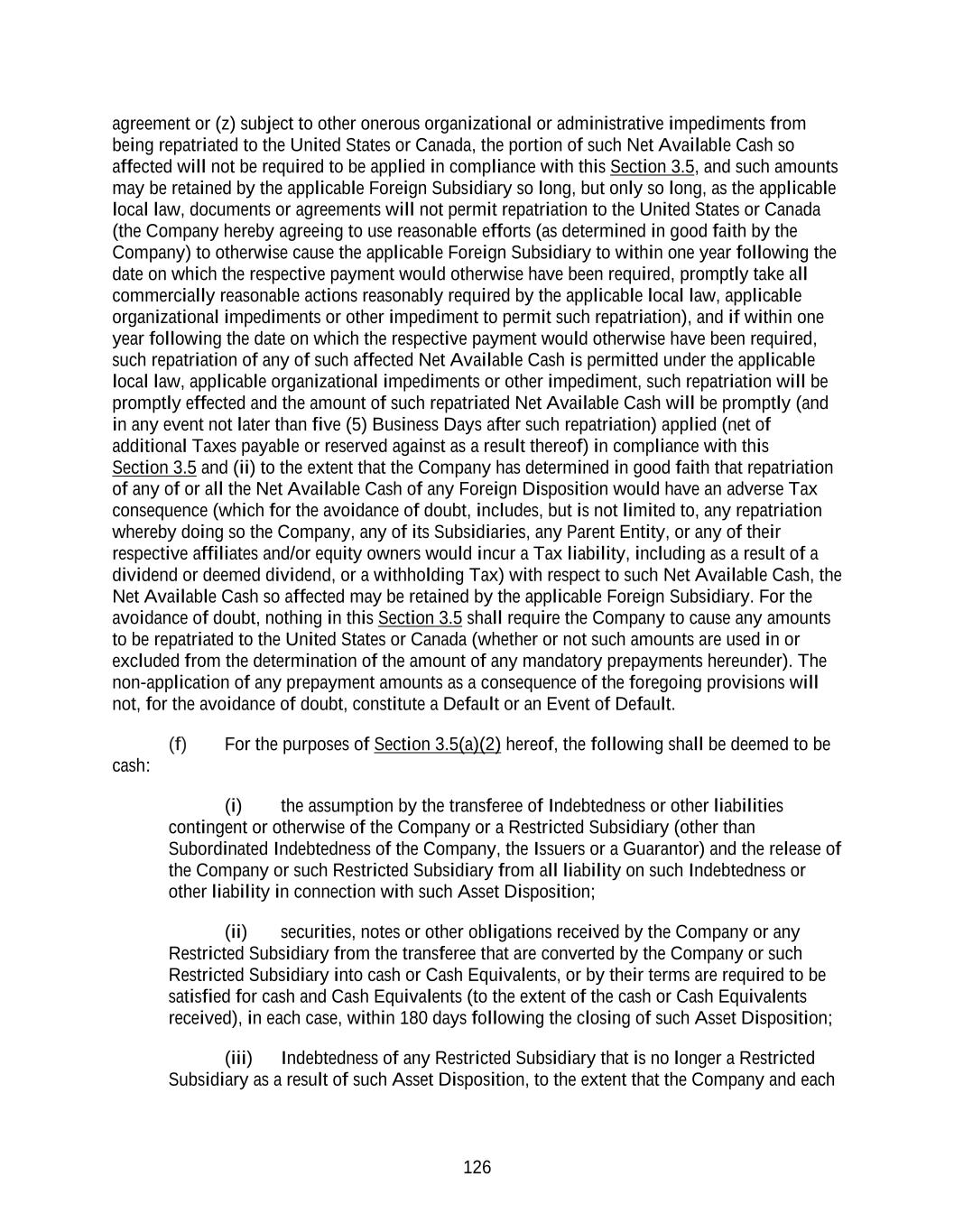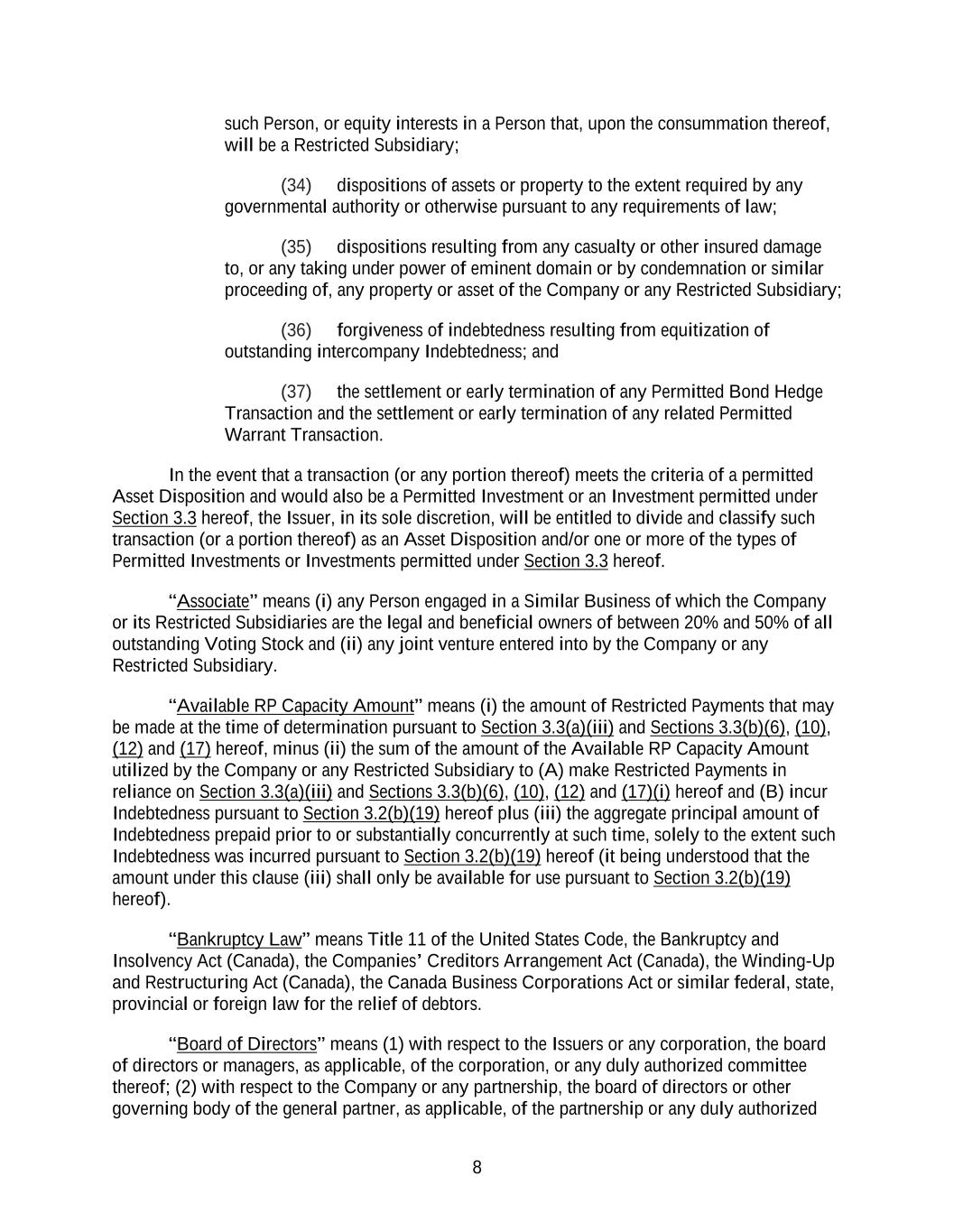 8 such Person, or equity interests in a Person that, upon the consummation thereof, will be a Restricted Subsidiary; (34) dispositions of assets or property to the extent required by any governmental authority or otherwise pursuant to any requirements of law; (35) dispositions resulting from any casualty or other insured damage to, or any taking under power of eminent domain or by condemnation or similar proceeding of, any property or asset of the Company or any Restricted Subsidiary; (36) forgiveness of indebtedness resulting from equitization of outstanding intercompany Indebtedness; and (37) the settlement or early termination of any Permitted Bond Hedge Transaction and the settlement or early termination of any related Permitted Warrant Transaction. In the event that a transaction (or any portion thereof) meets the criteria of a permitted Asset Disposition and would also be a Permitted Investment or an Investment permitted under Section 3.3 hereof, the Issuer, in its sole discretion, will be entitled to divide and classify such transaction (or a portion thereof) as an Asset Disposition and/or one or more of the types of Permitted Investments or Investments permitted under Section 3.3 hereof. “Associate” means (i) any Person engaged in a Similar Business of which the Company or its Restricted Subsidiaries are the legal and beneficial owners of between 20% and 50% of all outstanding Voting Stock and (ii) any joint venture entered into by the Company or any Restricted Subsidiary. “Available RP Capacity Amount” means (i) the amount of Restricted Payments that may be made at the time of determination pursuant to Section 3.3(a)(iii) and Sections 3.3(b)(6), (10), (12) and (17) hereof, minus (ii) the sum of the amount of the Available RP Capacity Amount utilized by the Company or any Restricted Subsidiary to (A) make Restricted Payments in reliance on Section 3.3(a)(iii) and Sections 3.3(b)(6), (10), (12) and (17)(i) hereof and (B) incur Indebtedness pursuant to Section 3.2(b)(19) hereof plus (iii) the aggregate principal amount of Indebtedness prepaid prior to or substantially concurrently at such time, solely to the extent such Indebtedness was incurred pursuant to Section 3.2(b)(19) hereof (it being understood that the amount under this clause (iii) shall only be available for use pursuant to Section 3.2(b)(19) hereof). “Bankruptcy Law” means Title 11 of the United States Code, the Bankruptcy and Insolvency Act (Canada), the Companies’ Creditors Arrangement Act (Canada), the Winding-Up and Restructuring Act (Canada), the Canada Business Corporations Act or similar federal, state, provincial or foreign law for the relief of debtors. “Board of Directors” means (1) with respect to the Issuers or any corporation, the board of directors or managers, as applicable, of the corporation, or any duly authorized committee thereof; (2) with respect to the Company or any partnership, the board of directors or other governing body of the general partner, as applicable, of the partnership or any duly authorized
