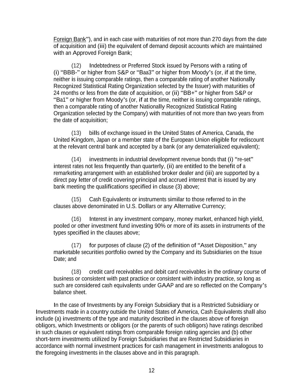 12 Foreign Bank”), and in each case with maturities of not more than 270 days from the date of acquisition and (iii) the equivalent of demand deposit accounts which are maintained with an Approved Foreign Bank; (12) Indebtedness or Preferred Stock issued by Persons with a rating of (i) “BBB-” or higher from S&P or “Baa3” or higher from Moody’s (or, if at the time, neither is issuing comparable ratings, then a comparable rating of another Nationally Recognized Statistical Rating Organization selected by the Issuer) with maturities of 24 months or less from the date of acquisition, or (ii) “BB+” or higher from S&P or “Ba1” or higher from Moody’s (or, if at the time, neither is issuing comparable ratings, then a comparable rating of another Nationally Recognized Statistical Rating Organization selected by the Company) with maturities of not more than two years from the date of acquisition; (13) bills of exchange issued in the United States of America, Canada, the United Kingdom, Japan or a member state of the European Union eligible for rediscount at the relevant central bank and accepted by a bank (or any dematerialized equivalent); (14) investments in industrial development revenue bonds that (i) “re-set” interest rates not less frequently than quarterly, (ii) are entitled to the benefit of a remarketing arrangement with an established broker dealer and (iii) are supported by a direct pay letter of credit covering principal and accrued interest that is issued by any bank meeting the qualifications specified in clause (3) above; (15) Cash Equivalents or instruments similar to those referred to in the clauses above denominated in U.S. Dollars or any Alternative Currency; (16) Interest in any investment company, money market, enhanced high yield, pooled or other investment fund investing 90% or more of its assets in instruments of the types specified in the clauses above; (17) for purposes of clause (2) of the definition of “Asset Disposition,” any marketable securities portfolio owned by the Company and its Subsidiaries on the Issue Date; and (18) credit card receivables and debit card receivables in the ordinary course of business or consistent with past practice or consistent with industry practice, so long as such are considered cash equivalents under GAAP and are so reflected on the Company’s balance sheet. In the case of Investments by any Foreign Subsidiary that is a Restricted Subsidiary or Investments made in a country outside the United States of America, Cash Equivalents shall also include (a) investments of the type and maturity described in the clauses above of foreign obligors, which Investments or obligors (or the parents of such obligors) have ratings described in such clauses or equivalent ratings from comparable foreign rating agencies and (b) other short-term investments utilized by Foreign Subsidiaries that are Restricted Subsidiaries in accordance with normal investment practices for cash management in investments analogous to the foregoing investments in the clauses above and in this paragraph.