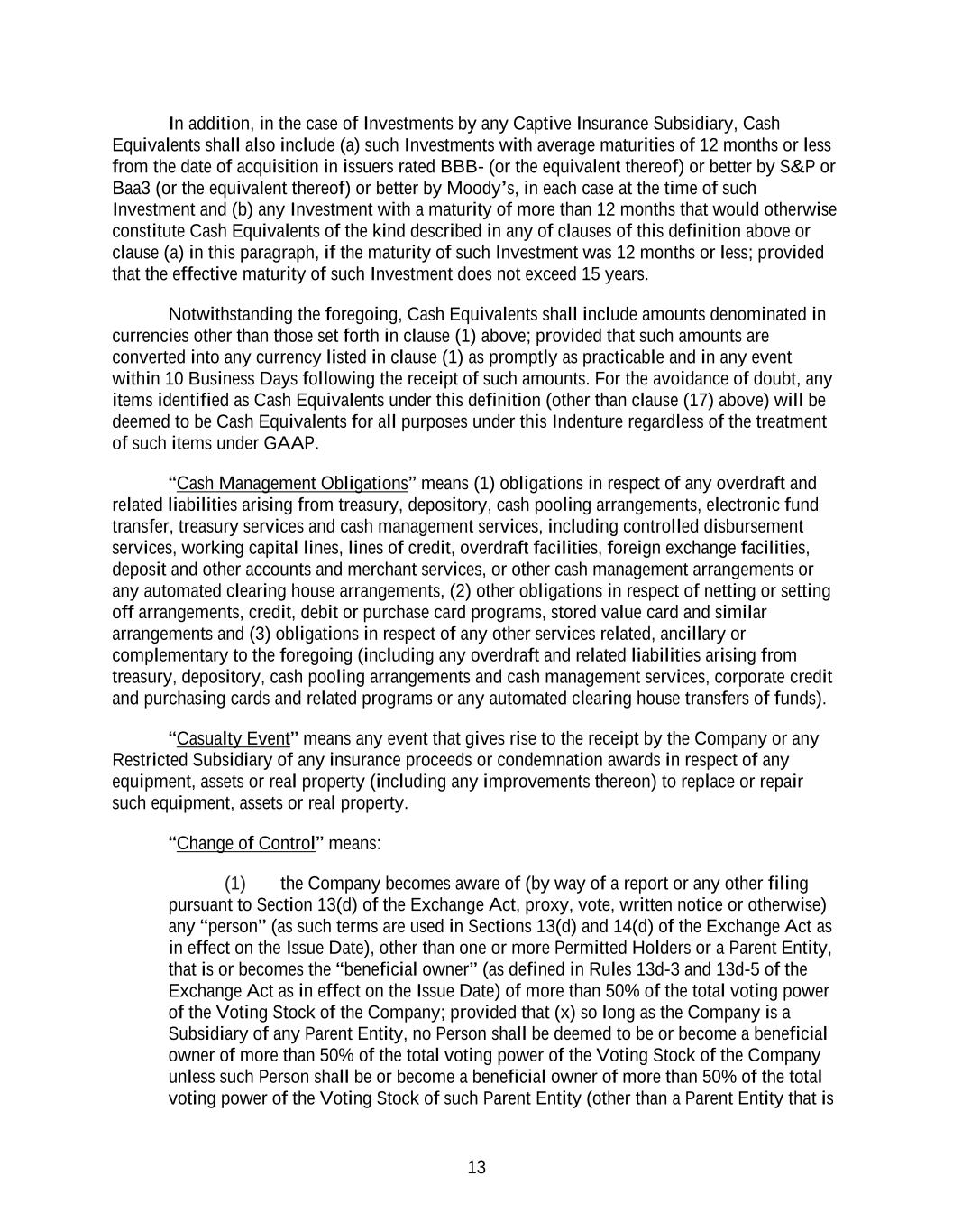 13 In addition, in the case of Investments by any Captive Insurance Subsidiary, Cash Equivalents shall also include (a) such Investments with average maturities of 12 months or less from the date of acquisition in issuers rated BBB- (or the equivalent thereof) or better by S&P or Baa3 (or the equivalent thereof) or better by Moody’s, in each case at the time of such Investment and (b) any Investment with a maturity of more than 12 months that would otherwise constitute Cash Equivalents of the kind described in any of clauses of this definition above or clause (a) in this paragraph, if the maturity of such Investment was 12 months or less; provided that the effective maturity of such Investment does not exceed 15 years. Notwithstanding the foregoing, Cash Equivalents shall include amounts denominated in currencies other than those set forth in clause (1) above; provided that such amounts are converted into any currency listed in clause (1) as promptly as practicable and in any event within 10 Business Days following the receipt of such amounts. For the avoidance of doubt, any items identified as Cash Equivalents under this definition (other than clause (17) above) will be deemed to be Cash Equivalents for all purposes under this Indenture regardless of the treatment of such items under GAAP. “Cash Management Obligations” means (1) obligations in respect of any overdraft and related liabilities arising from treasury, depository, cash pooling arrangements, electronic fund transfer, treasury services and cash management services, including controlled disbursement services, working capital lines, lines of credit, overdraft facilities, foreign exchange facilities, deposit and other accounts and merchant services, or other cash management arrangements or any automated clearing house arrangements, (2) other obligations in respect of netting or setting off arrangements, credit, debit or purchase card programs, stored value card and similar arrangements and (3) obligations in respect of any other services related, ancillary or complementary to the foregoing (including any overdraft and related liabilities arising from treasury, depository, cash pooling arrangements and cash management services, corporate credit and purchasing cards and related programs or any automated clearing house transfers of funds). “Casualty Event” means any event that gives rise to the receipt by the Company or any Restricted Subsidiary of any insurance proceeds or condemnation awards in respect of any equipment, assets or real property (including any improvements thereon) to replace or repair such equipment, assets or real property. “Change of Control” means: (1) the Company becomes aware of (by way of a report or any other filing pursuant to Section 13(d) of the Exchange Act, proxy, vote, written notice or otherwise) any “person” (as such terms are used in Sections 13(d) and 14(d) of the Exchange Act as in effect on the Issue Date), other than one or more Permitted Holders or a Parent Entity, that is or becomes the “beneficial owner” (as defined in Rules 13d-3 and 13d-5 of the Exchange Act as in effect on the Issue Date) of more than 50% of the total voting power of the Voting Stock of the Company; provided that (x) so long as the Company is a Subsidiary of any Parent Entity, no Person shall be deemed to be or become a beneficial owner of more than 50% of the total voting power of the Voting Stock of the Company unless such Person shall be or become a beneficial owner of more than 50% of the total voting power of the Voting Stock of such Parent Entity (other than a Parent Entity that is